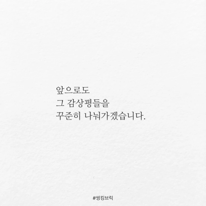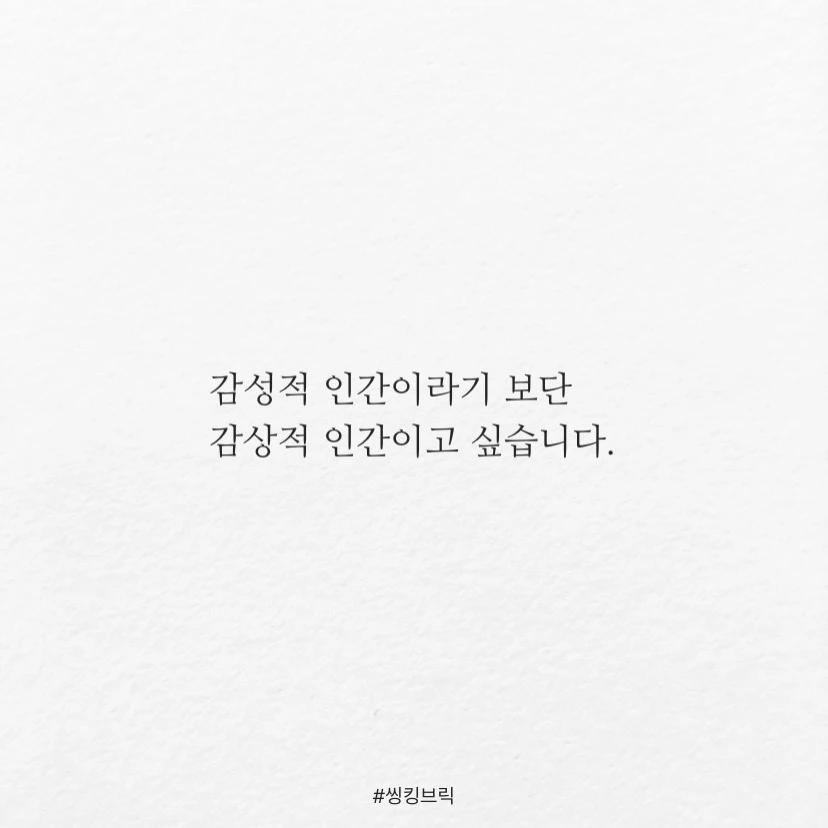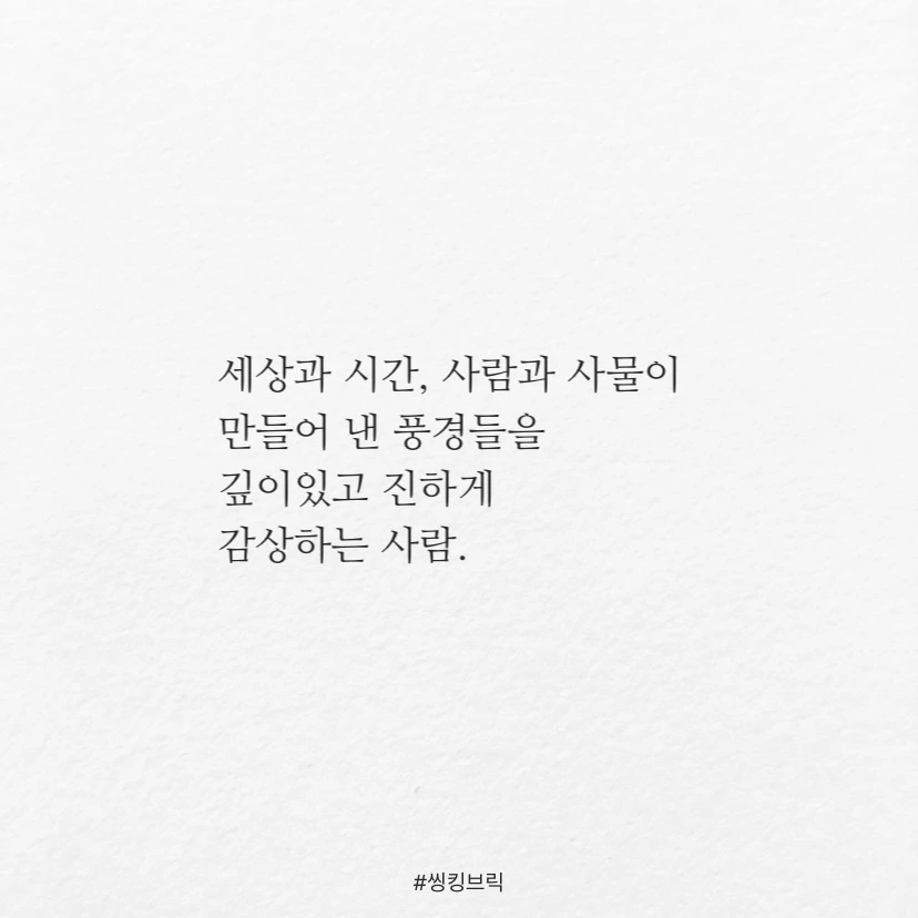 감성적 인간이라기 보단감상적 인간이고 싶습니다.세상과 시간, 사람과 사물이만들어 낸 풍경들을깊이있고 진하게 감상하는 사람.앞으로도 그 감상평들을꾸준히 나눠가겠습니다.#씽킹브릭