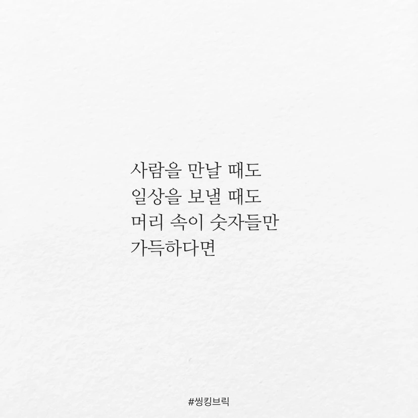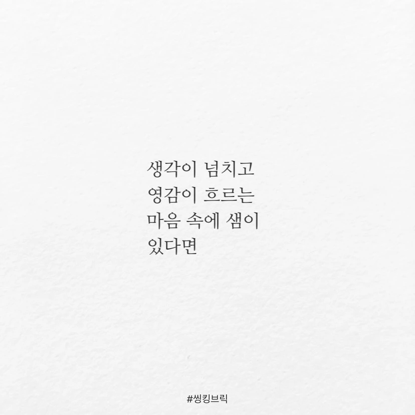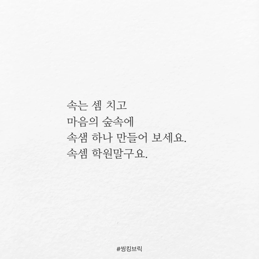 사람을 만날 때도일상을 보낼 때도머리 속이 숫자들만가득하다면이럴 때 ‘속셈’이있다고 말합니다.생각이 넘치고영감이 흐르는마음 속에 샘이있다면이걸 저는‘속샘’이라부르고 싶네요.속는 셈 치고마음의 숲에속샘 하나 만들어 보세요.속셈 학원말구요.날마다 기쁨이넘쳐 흐를테니#씽킹브릭#속샘학원원장우현수