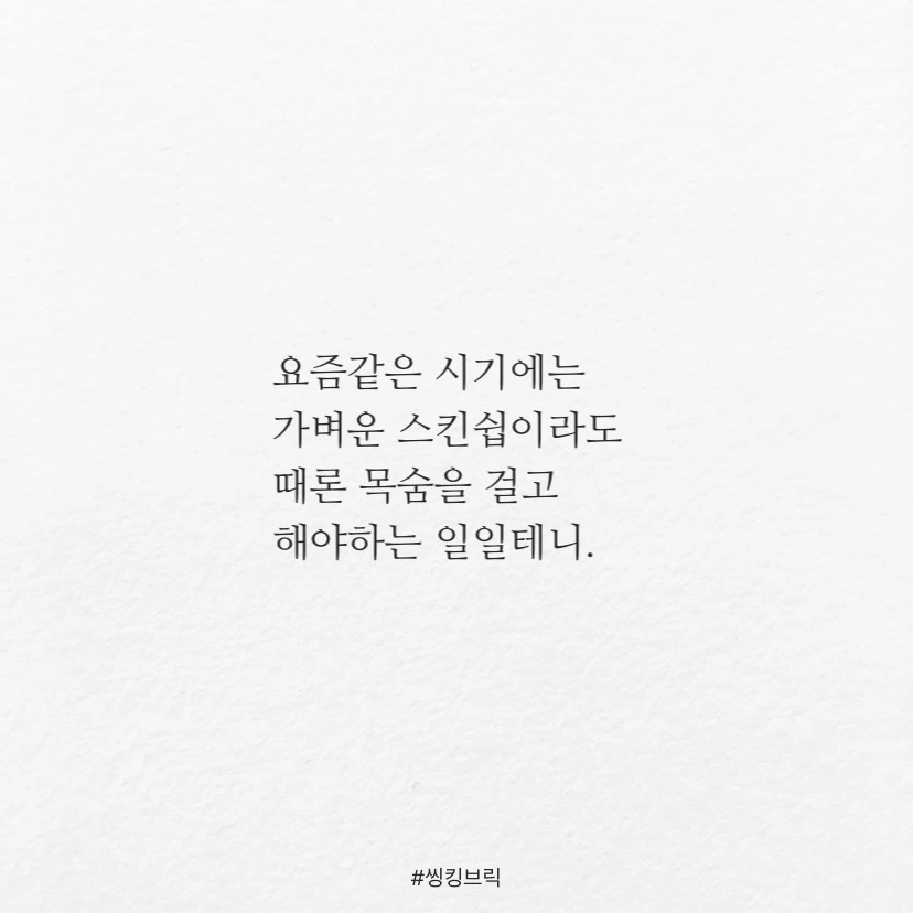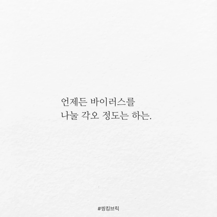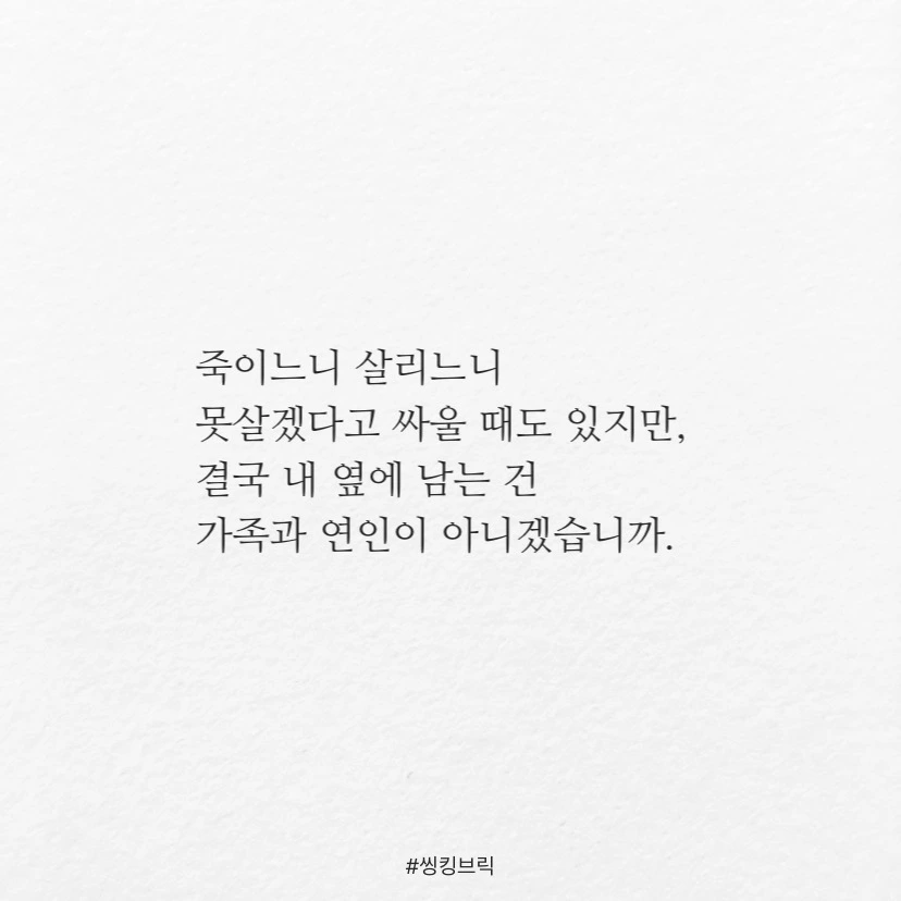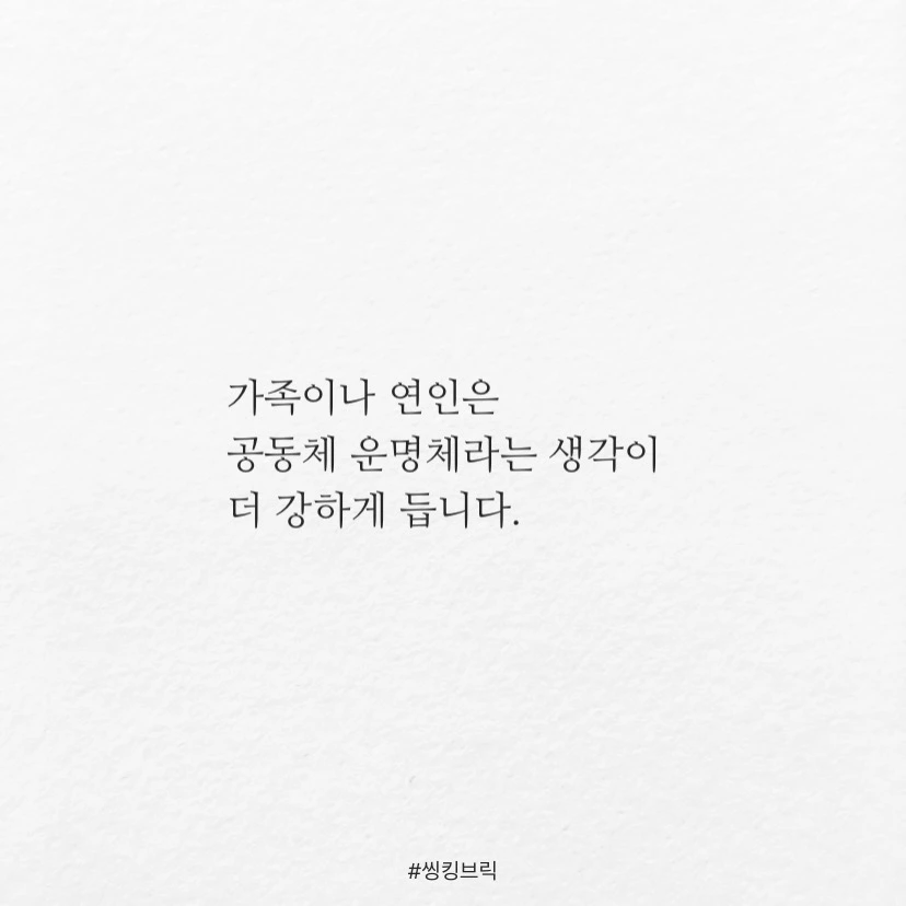 가족이나 연인은 공동체 운명체라는 생각이더 강하게 듭니다.요즘같은 시기에는 가벼운 스킨쉽이라도때론 목숨을 걸고 해야하는 일일테니.죽이느니 살리느니못살겠다고 싸울 때도 있지만,결국 내 옆에 남는 건가족과 연인이 아니겠습니까.언제 바이러스를 나눌 각오 정도는 하는.#씽킹브릭