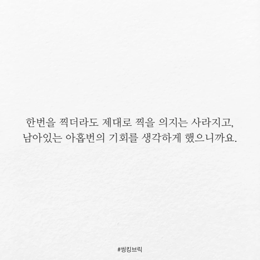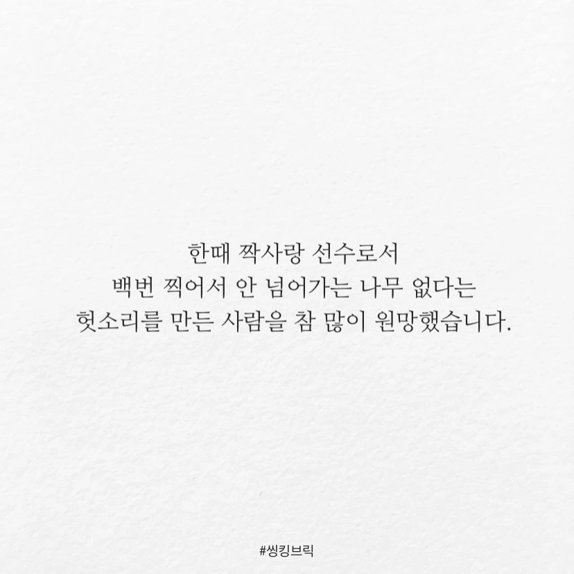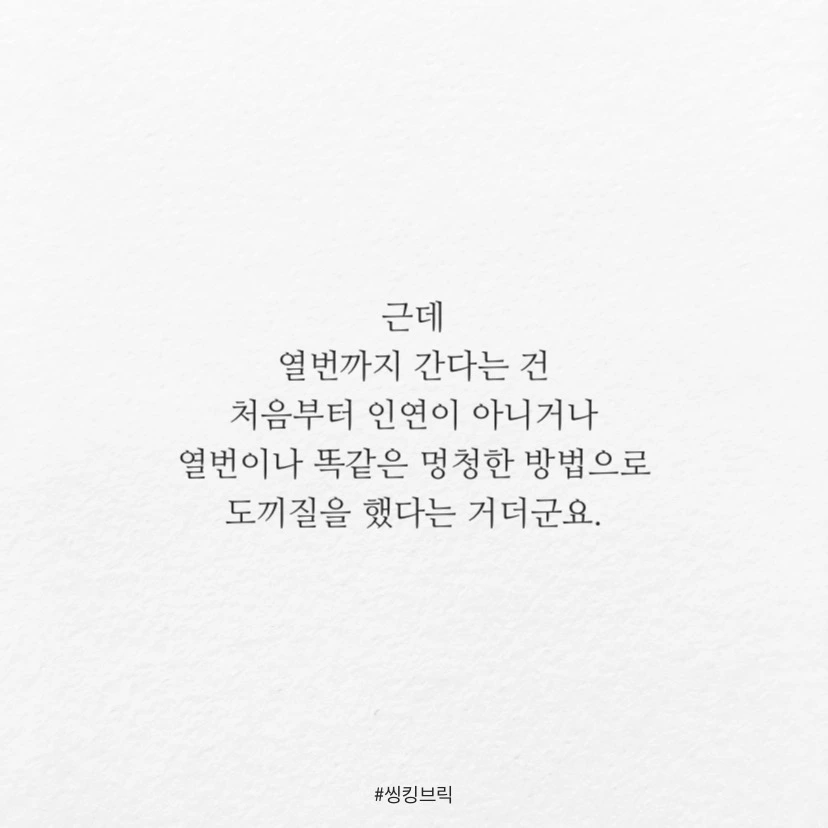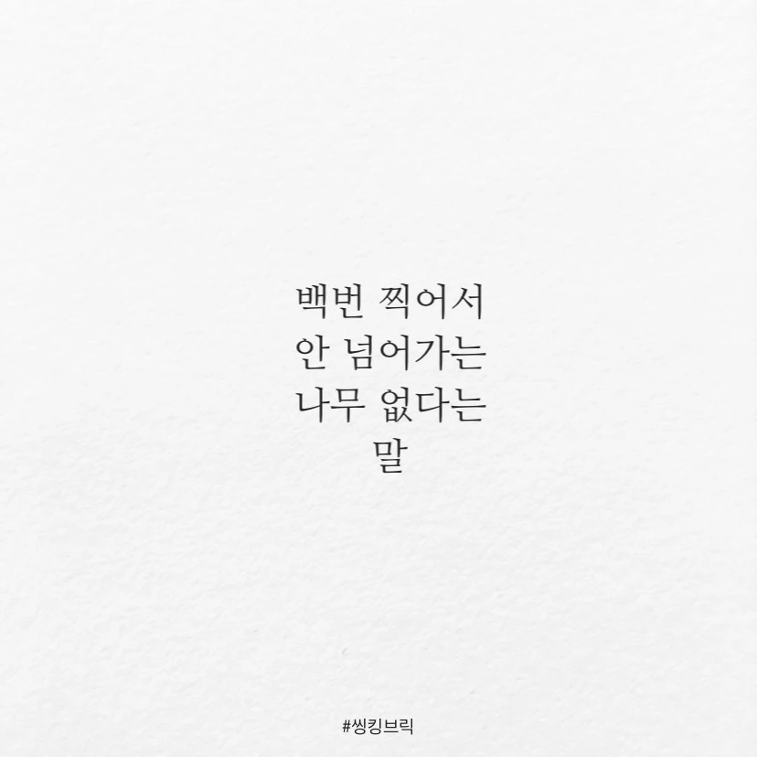 한때 짝사랑 선수로서백번 찍어서 안 넘어가는 나무 없다는헛소리를 만든 사람을 참 많이 원망했습니다.한번을 찍더라도 제대로 찍을 의지는 사라지고,남아있는 아홉번의 기회를 생각하게 했으니까요.근데열번까지 간다는 건처음부터 인연이 아니거나열번이나 똑같은 멍청한 방법으로도끼질을 했다는 거더군요.그게 제 아무리 금도끼라도.#씽킹브릭