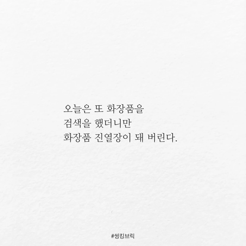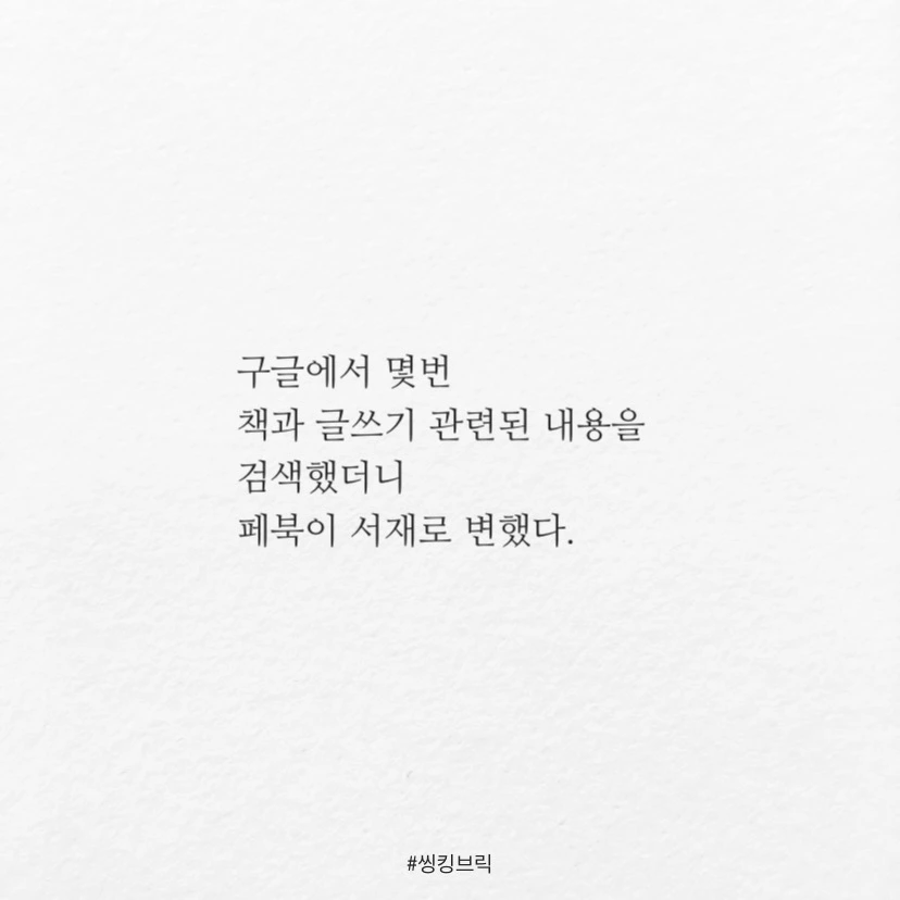 구글에서 몇번책과 글쓰기 관련된 내용을검색했더니페북이 서재로 변했다.오늘은 또 화장품을검색을 했더니만화장품 진열장이 돼 버린다.그야말로검색한 것만보여주는 세상.#씽킹브릭