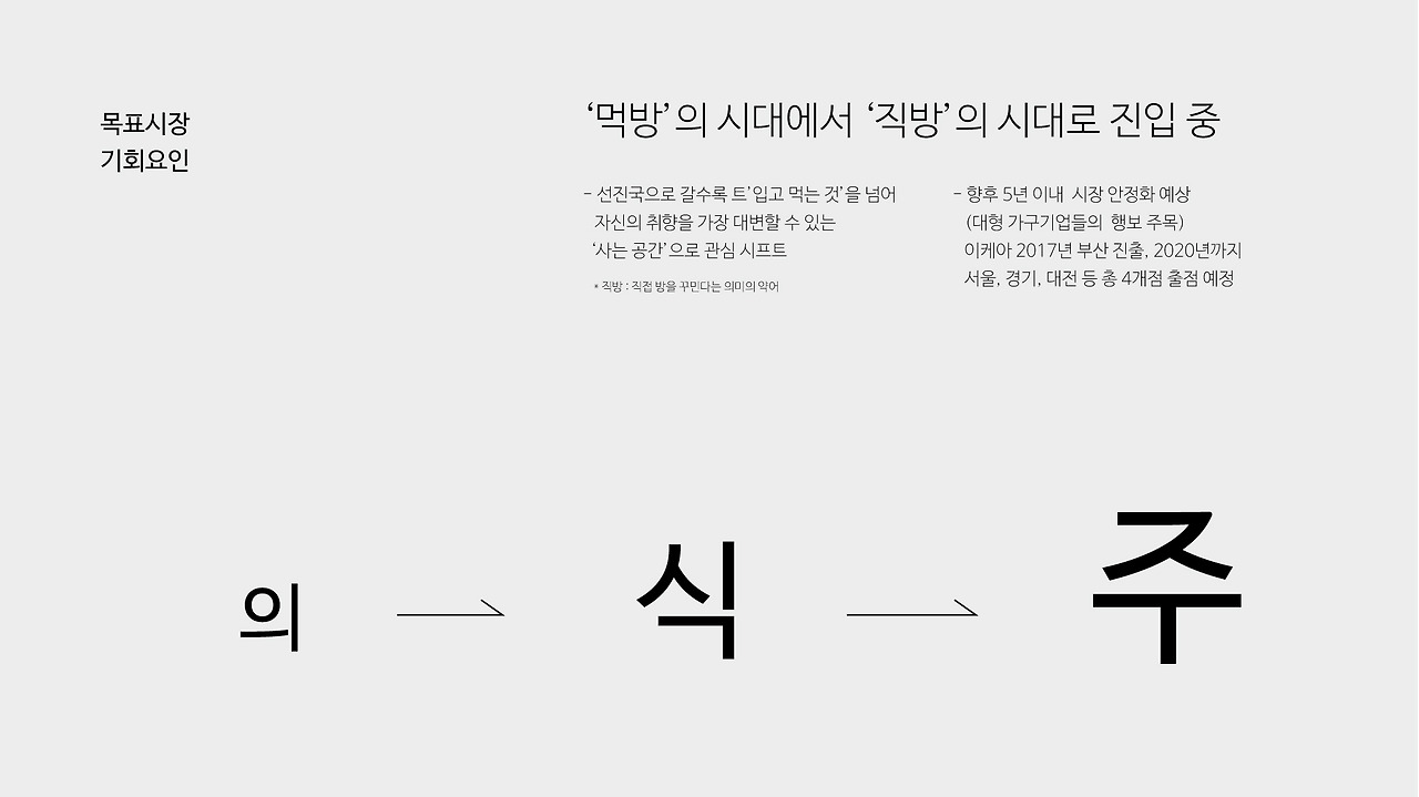 마침 최근 경향을 먹방의 시대에서 직방의 시대로 전환되는 의식주 중에 '주'의 시대로 옮겨가는 흐름이 보였습니다. 그 흐름은 첫번째로 갑자기 늘어난 집꾸미기를 테마로한 티비 프로그램이었구요. 두번째는 인터넷으로 이케아를 구입하던 감각적인 소비자들이 2014년 처음으로 국내시장에 오프라인 매장을 연 이케아를 찾아 상품을 구입한 시점이 아니었을까 생각하고 있습니다. 감각을 중시하는 소수의 사람들의 취미가 일반 대중들로 확대된거죠. 지금도 이러한 경향은 온오프라인을 가리지 않고 계속되고 있는 것 같습니다.
