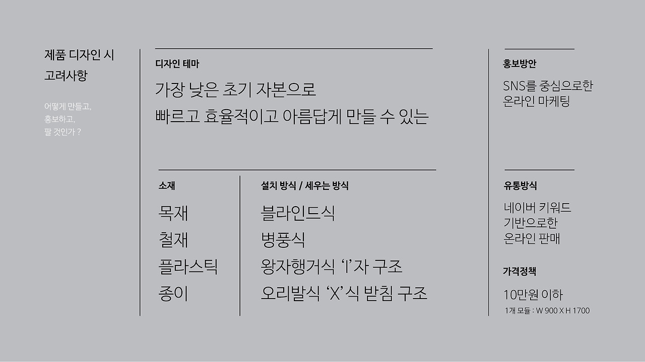 위에서 말했던 장미빛 기획들과 개념과 가치와 특별함도 좋지만 결국 우리가 만들어 내야 하는 건 FARTI만의 파티션 제품입니다. 실제 사업성을 따져보기 위해 대략적인 실행 계획을 구상하려고 하자 소재와 설치하는 방식이 굉장히 중요하다는 생각이 들었습니다.