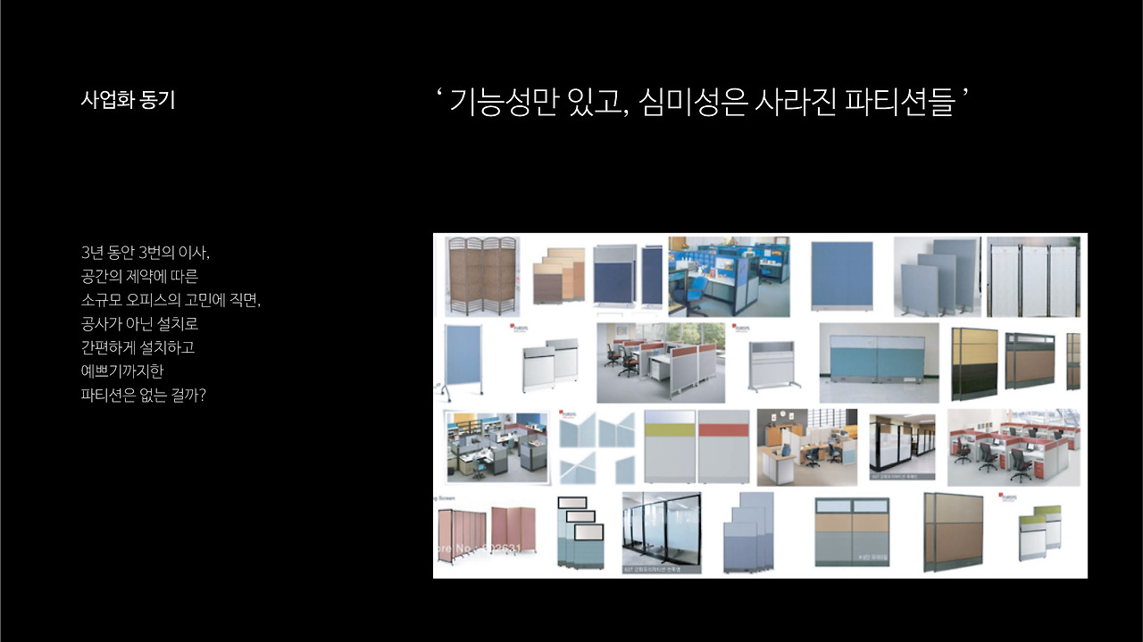 그 때 생각이 ‘아, 이거 디자인 괜찮고 가격대도 합리적인 파티션만 나오면 강남 골목 골목에 자리하고 있는 우리같은 디자인에이전시들이 너도 나도 살 것 같데’라는 생각이 들었습니다.