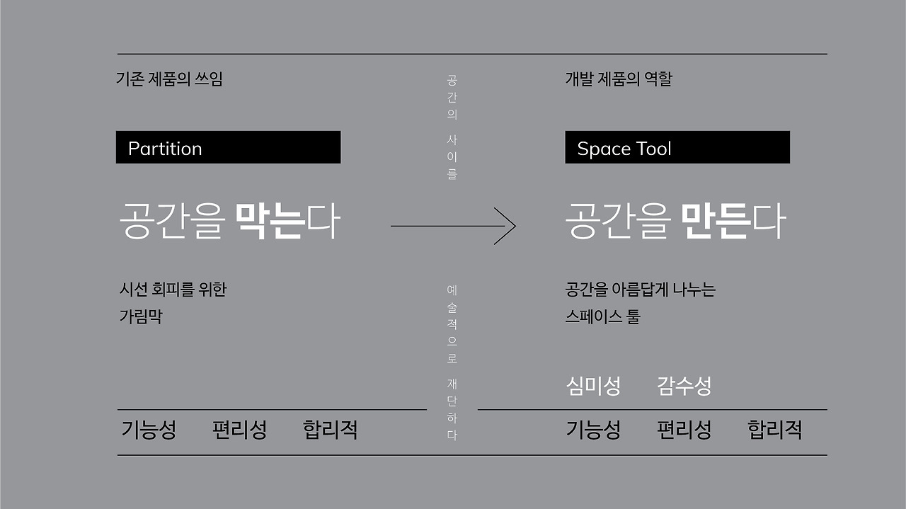 FARTI 브랜드가 고객에게 제공할 핵심가치와 역할은 공간을 '막는' 파티션에서 공간을 '만드'는 파티션으로 변해야 한다는 것이었습니다. 기능성, 편리성, 합리적인 면은 기본으로 하되 심미성과 감수성을 담은 제품으로