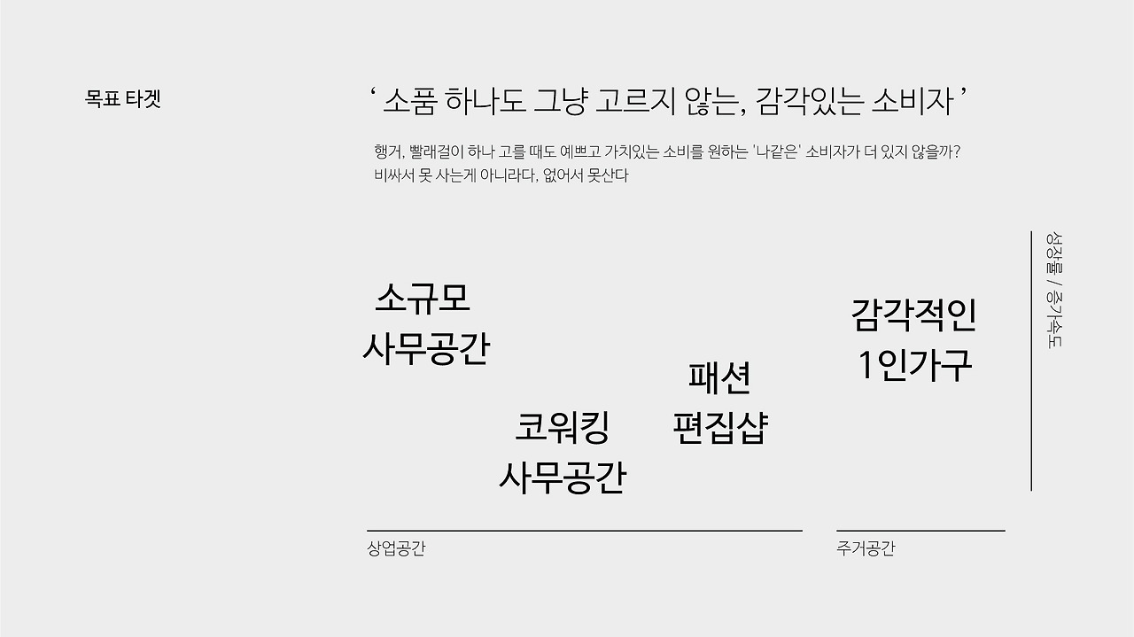 물론 주고객층은 행거 하나 빨래걸이 하나 세면대 위에 비누 케이스 하나 고를 때도 이마트, 롯데마트, 홈플러스까지 다 뒤질 것 같은 섬세한 감각과 취향을 가진 분들이 주요 소비층이되겠죠. 80년대 부장님 스타일은 절대 아닐겁니다.
