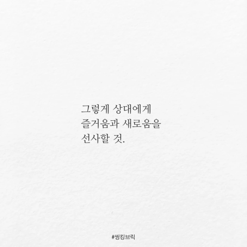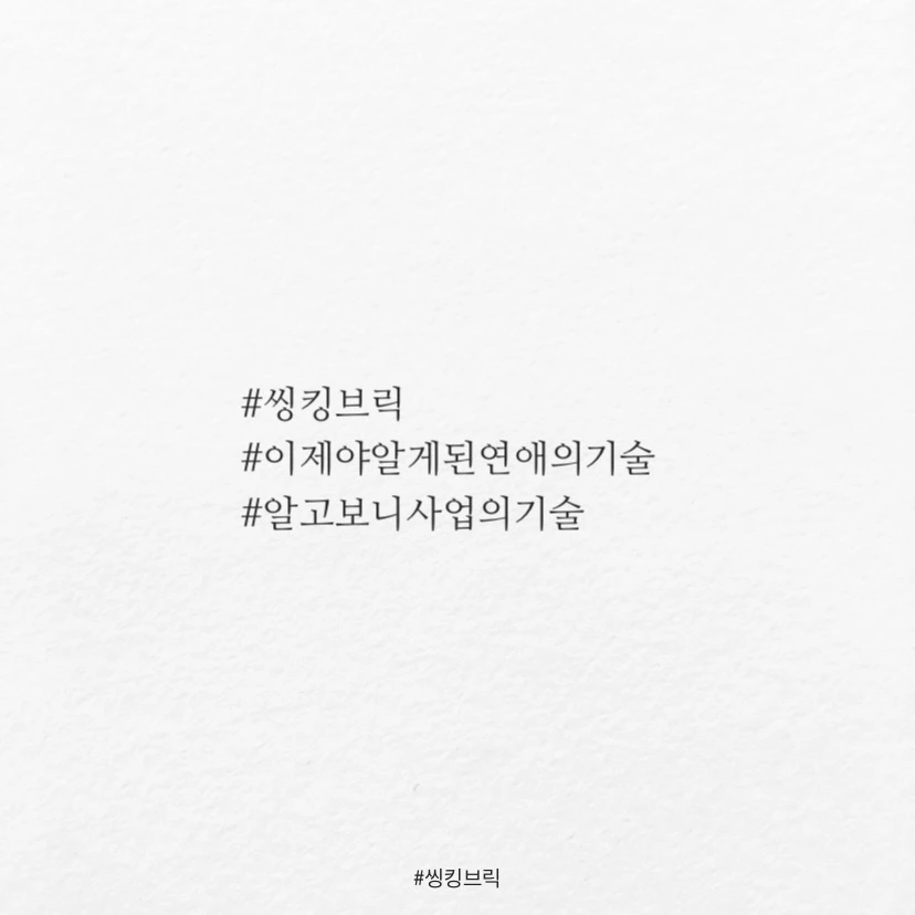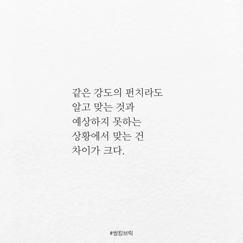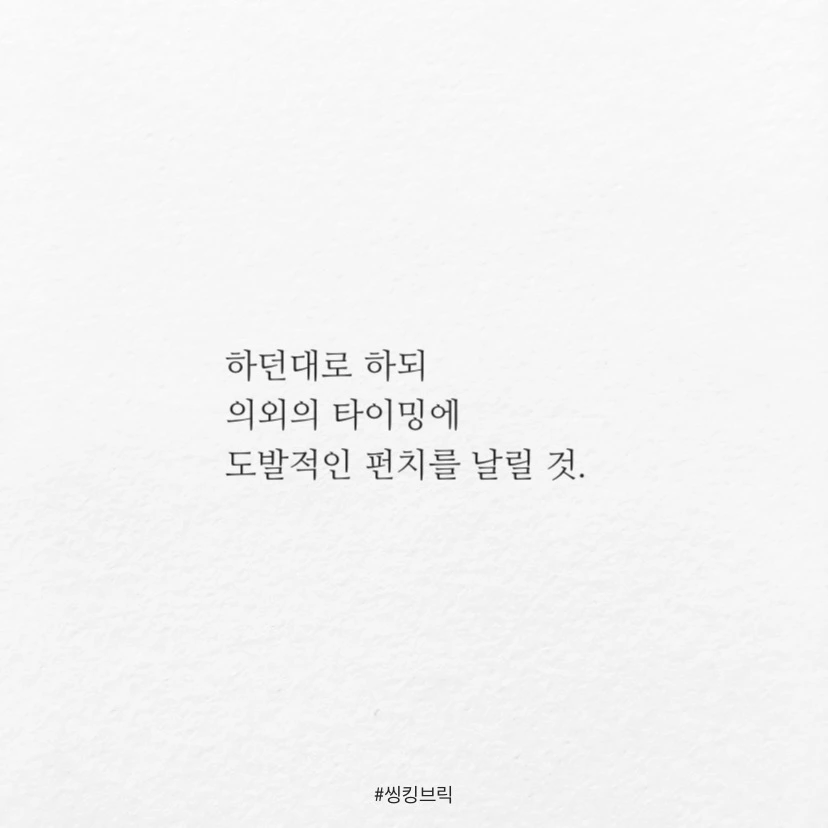같은 강도의 펀치라도 알고 맞는 것과예상하지 못하는 상황에서 맞는 건차이가 크다.예상대로하되예상하는 대로만움직이지 않을 것.하던대로 하되의외의 타이밍에도발적인 펀치를 날릴 것.그렇게 상대에게즐거움과 새로움을선사할 것.변하지 않으면서변화할 것.#씽킹브릭#이제야알게된연예의기술#알고보니사업의기술