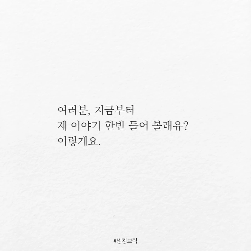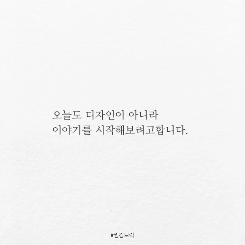 디자인을 한다고 생각하면 참 막막할 때가 많은데,이야기를 시작한다고 접근하면좀 마음이 편해지더라구요.여러분, 지금부터제 이야기 한번 들어 볼래유?이렇게요.그래서 저는 오늘도 디자인이 아니라,이야기를 시작해보려고합니다.#씽킹브릭