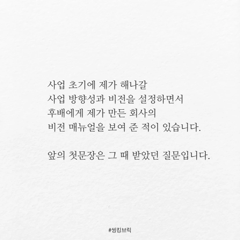 사업 초기 내가 해나갈 사업 방향성과 비전을 설정하면서, 주위에 있는 몇 몇 친구들에게 제가 만든 사업 비전매뉴얼을 보여 준 적이 있습니다. 위의 질문은 그 때 받았던 건데요. 프로젝트를 시작할 때마다 마치 환청처럼 여전히 귓가에 맴도는 말입니다.