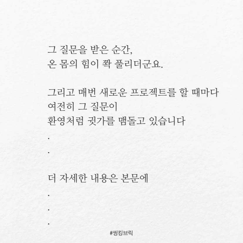 급소를 맞고 잠시 숨이 막히는 기분이었습니다. 그 지점이 딱 빠져 있었는데, 그 친구의 질문이 그 지점을 지적했던 겁니다. 맞는 말이였어요. 여느 브랜딩이나 디자인 회사와 제가 하려고하는 서비스가 완전히 다르거나 특별할 게 없었어요. 접근 방법이 조금 다르고, 경험치에 차이가 있고, 구현해내는 능력이 다른거지 그 분야에서 독보적인 어떤 것을 가진 건 아니었거든요. 결국 브랜딩을 해서 나온 시각적인 결과물의 질감들과 인상이 다른거지 완전히 다르지 않았던 거죠.