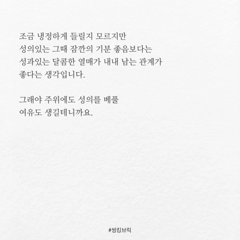 조금 냉정하게 들릴지 모르지만 성의있는 그때 잠깐의 기분 좋음보다는 성과있는 달콤한 열매가 내내 남는 관계가 좋다는 생각입니다. 그래야 주위에도 성의를 베풀 여유도 생길테니까요.