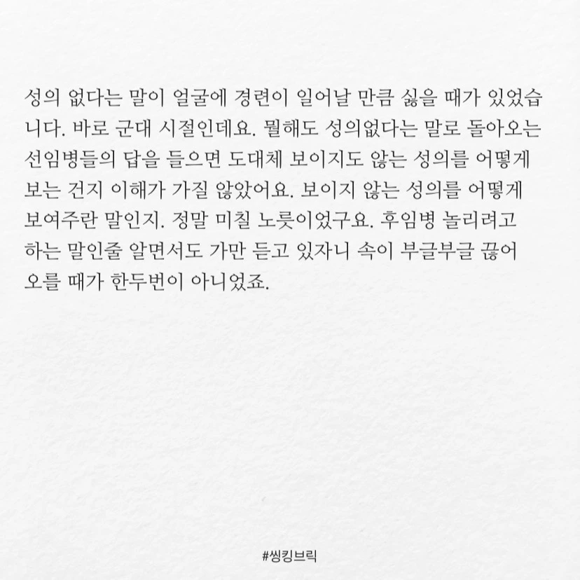 성의 없다는 말이 얼굴에 경련이 일어날 만큼 싫을 때가 있었습니다. 바로 군대 시절인데요. 뭘해도 성의없다는 말로 돌아오는 선임병들의 답을 들으면 도대체 보이지도 않는 성의를 어떻게 보는 건지 이해가 가질 않았어요. 보이지 않는 성의를 어떻게 보여주란 말인지. 정말 미칠 노릇이었구요. 후임병 놀리려고 하는 말인줄 알면서도 가만 듣고 있자니 속이 부글부글 끊어 오를 때가 한두번이 아니었죠.