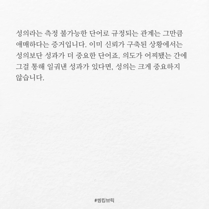 성의라는 측정 불가능한 단어로 규정되는 관계는 그만큼 애매하다는 증거입니다. 이미 신뢰가 구축된 상황에서는 성의보단 성과가 더 중요한 단어죠. 의도가 어찌됐는 간에 그걸 통해 일궈낸 성과가 있다면, 성의는 크게 중요하지 않습니다.