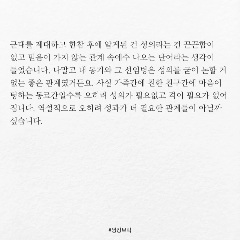 군대를 제대하고 한참 후에 알게된 건 성의라는 건 끈끈함이 없고 믿음이 가지 않는 관계 속에서 나오는 단어라는 생각이 들었습니다. 나말고 내 동기와 그 선임병은 성의를 굳이 논할 거 없는 좋은 관계였거든요. 사실 가족간에 친한 친구간에 마음이 텅하는 동료간일수록 오히려 성의가 필요없고 격이 필요가 없어집니다. 역설적으로 오히려 성과가 더 필요한 관계들이 아닐까 싶습니다.