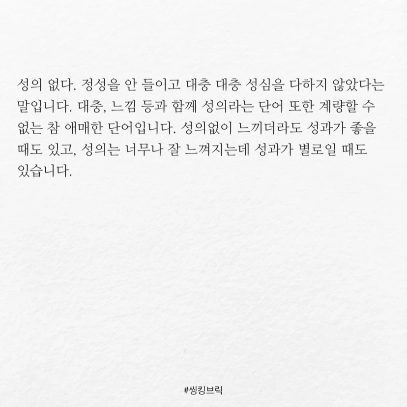 성의 없다. 정성을 안 들이고 대충 대충 성심을 다하지 않았다는 말입니다. 대충, 느낌 등과 함께 성의라는 단어 또한 계량할 수 없는 참 애매한 단어입니다. 성의없이 느끼더라도 성과가 좋을 때도 있고, 성의는 너무나 잘 느껴지는데 성과가 별로일 때도 있습니다.