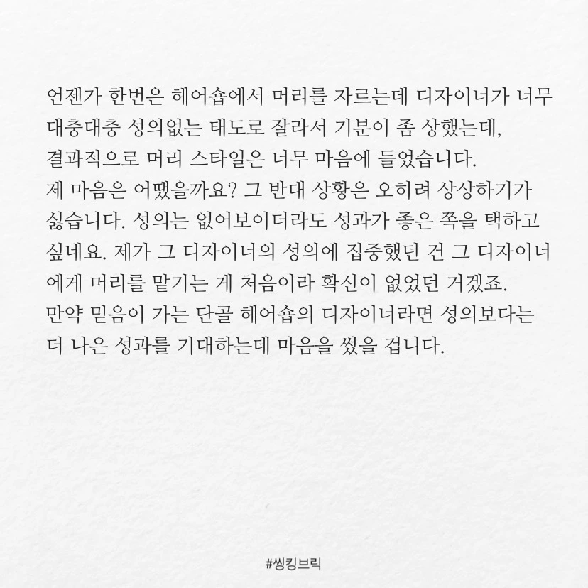 언젠가 한번은 헤어숍에서 머리를 자르는데 디자이너가 너무 대충대충 성의없는 태도로 잘라서 기분이 좀 상했는데, 결과적으로 머리 스타일은 너무 마음에 들었습니다. 제 마음은 어땠을까요? 그 반대 상황은 오히려 상상하기가 싫습니다. 성의는 없어보이더라도 성과가 좋은 쪽을 택하고 싶네요. 제가 그 디자이너의 성의에 집중했던 건 그 디자이너에게 머리를 맡기는 게 처음이라 확신이 없었던 거겠죠. 만약 믿음이 가는 단골 헤어숍의 디자이너라면 성의보다는 더 나은 성과를 기대하는데 마음을 썼을 겁니다.