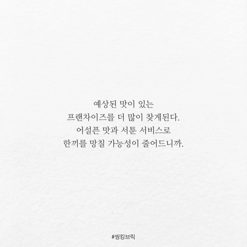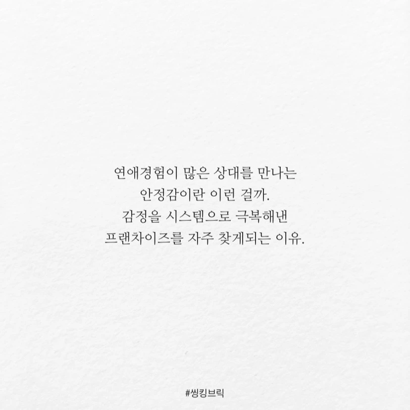 예상된 맛이 있는 프랜차이즈를 더 많이 찾게된다.어설픈 맛과 서툰 서비스로한끼를 망칠 가능성이 줄어드니까.조미료와 설탕 범벅이라도 상관없다.소중한 휴식 시간을 탐색과 모험하는수고로움으로 쓰긴 싫으니까.연애경험이 많은 상대를 만나는 안정감이란 이런 걸까.감정을 시스템으로 극복해낸프랜차이즈를 자주 찾게되는 이유.#씽킹브릭#연애좀해봤을것같은스벅이