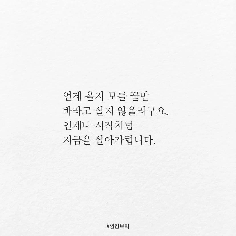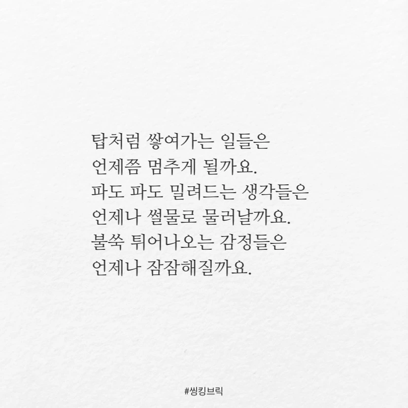 세상을 얼려 버릴 것 같던 일월의 칼바람도모든걸 녹여 버릴 것 같은 팔월의 태양도계절의 끝을 알기에견딜 수 있습니다.그래도 이렇게나 끈질기고 지루한 장마는 처음이네요.탑처럼 쌓여가는 일들은언제쯤 멈추게 될까요.파도 파도 밀려드는 생각들은언제나 썰물로 물러날까요.불쑥 튀어나오는 감정들은언제나 잠잠해질까요.언제 올지 모를 끝만바라고 살지 않을려구요.언제나 시작처럼지금을 살아가렵니다.#씽킹브릭