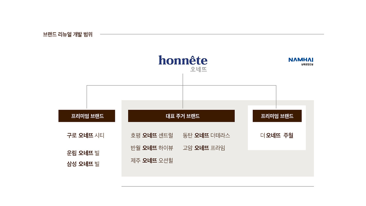 남해종합건설 1977년 설립해 건축·토목·조경·환경등의 사업에만 전념해 왔습니다. 정직과 신뢰의 경영으로 고객들에게 언제나 기본과 원칙을 지키고자 노력하는 중견기업입니다. 이번 개발된 르오네뜨(Le honnete) BI는 기존 주거 대표 브랜드인 오네뜨(honnete)의 프리미엄 주거 브랜드입니다. 변화하는 고객층의 기대를 충족시키고 경쟁 브랜드들의 고급화 추세에 따라 프리미엄급의 브랜드가 필요로 했습니다. 기존 아파트 보다 한차원 높은 공간 문화를 제공하기 위한 전략을 생각하기에 앞 서 르오네뜨(Le honnete)가 추구하는 프리미엄에 대해 정의를 내려야 했습니다. 과연 르오네뜨(Le honnete)가 말하는 프리미엄이란 무엇인가?에 대한 질문에 답을 찾지 않고서는