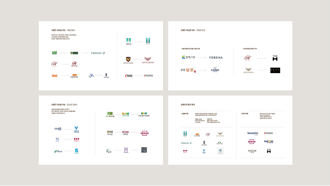 첫번째로 대형 건설사 아파트 브랜드들은 규모와 브랜드 파워에 걸맞게 점진적으로 브랜드를 잘 유지하고 있었습니다. 전반적으로 시대 감각과 고객의 눈 높이에 맞는 프리미엄한 색상과 형태로 변화하고 있었습니다.