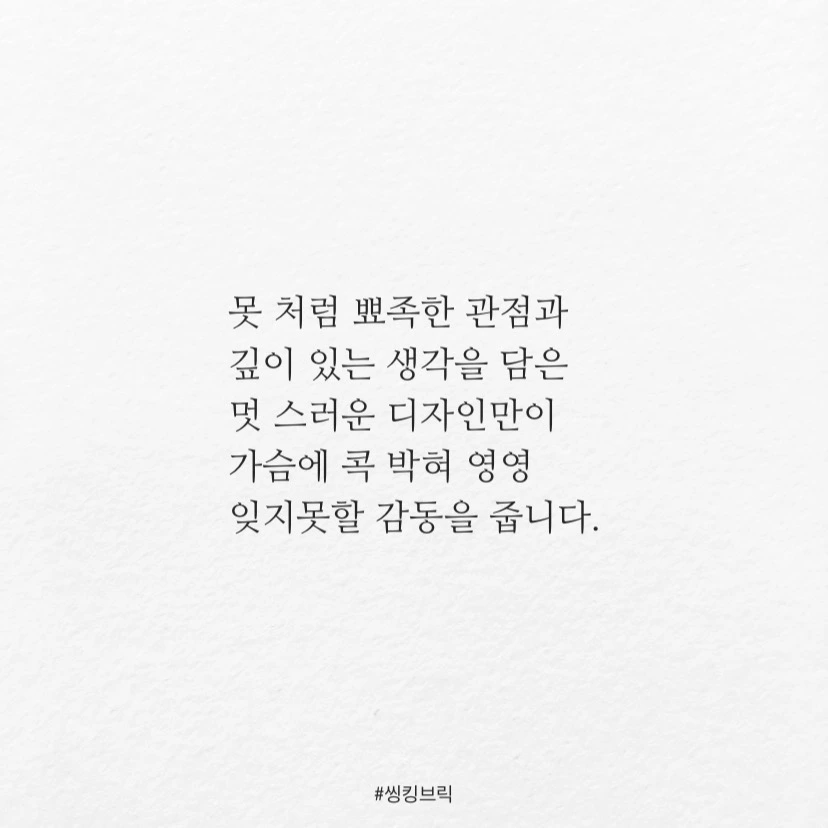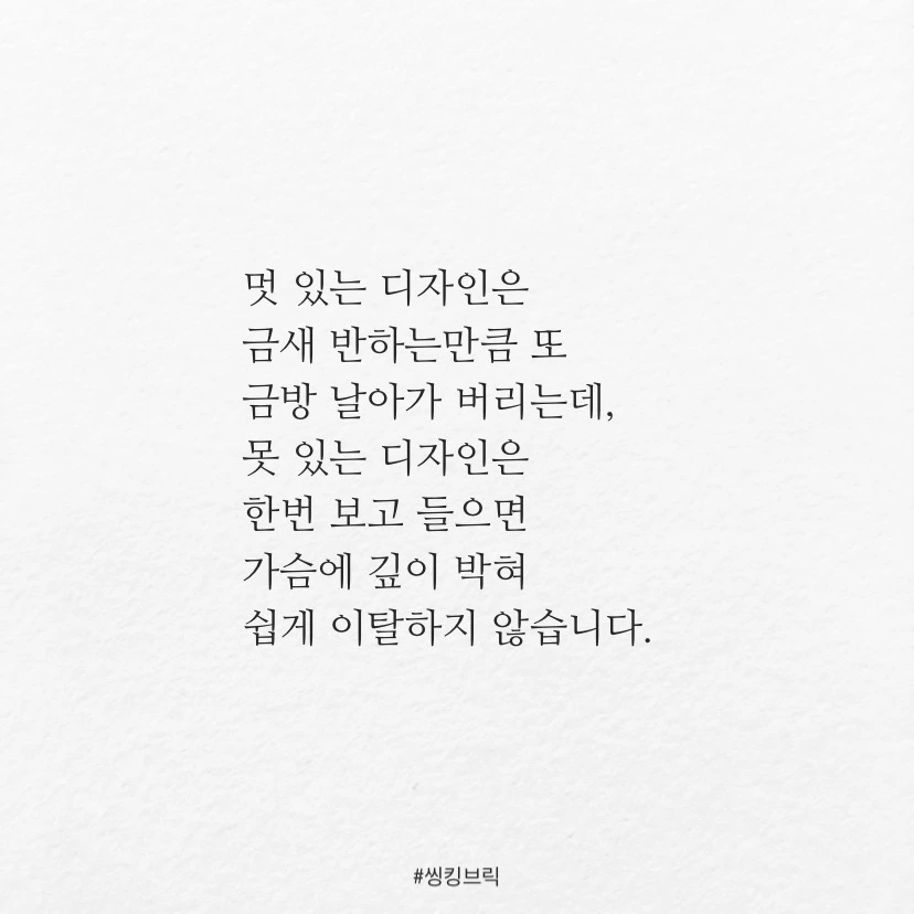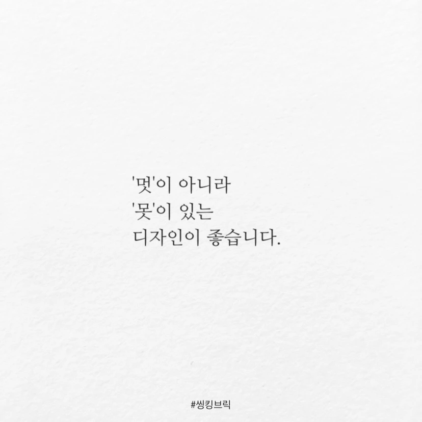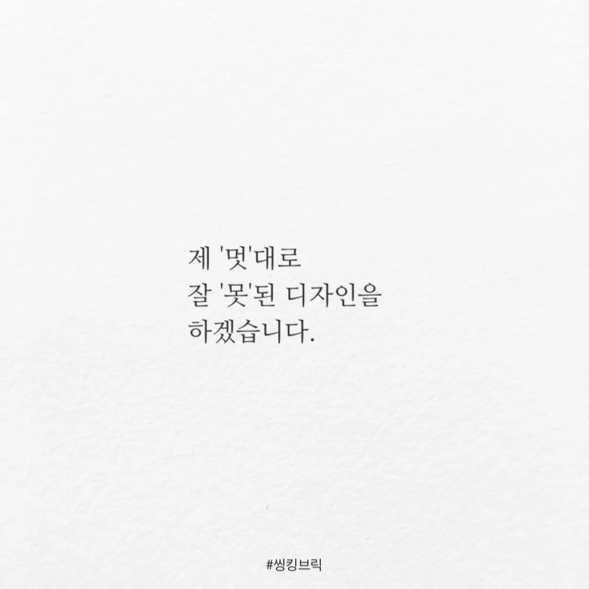 '멋'이 아니라 '못'이 있는디자인이 좋습니다.멋 있는 디자인은금새 반하는만큼 또 금방 날아가 버리는데,못 있는 디자인은한번 보고 들으면가슴에 깊이 박혀쉽게 이탈하지 않습니다.못 처럼 뾰족한 관점과깊이 있는 생각을 담은멋 스러운 디자인만이가슴에 콕 박혀 영영 잊지못할 감동을 줍니다.제 '멋'대로잘 '못'된 디자인을 하겠습니다.#씽킹브릭