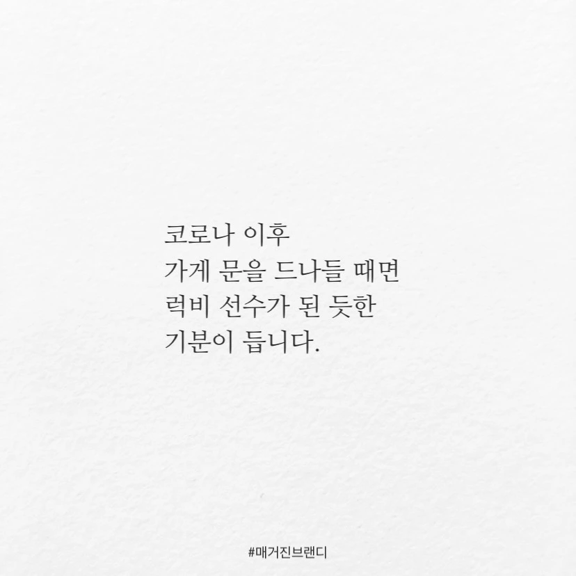 코로나 이후가게 문을 드나들 때면럭비 선수가 된 듯한 기분이 듭니다.문과 몸싸움을 할 때가 많아졌어요.어떨 땐 엉덩이로어떨 땐 어깨로가끔 머리로도밀쳐 버립니다.그립네요.문의 손잡이와 점잖게 악수하던그 시절이.#씽킹브릭#출근길에커피를사고나오다