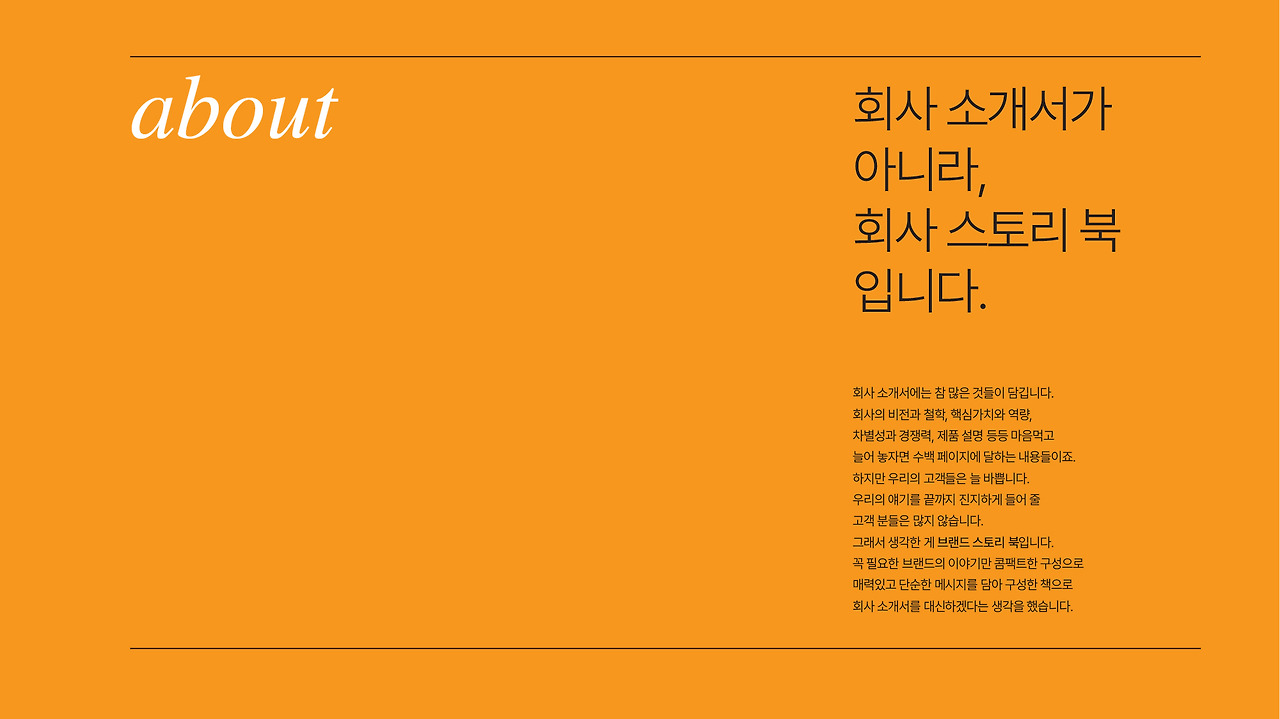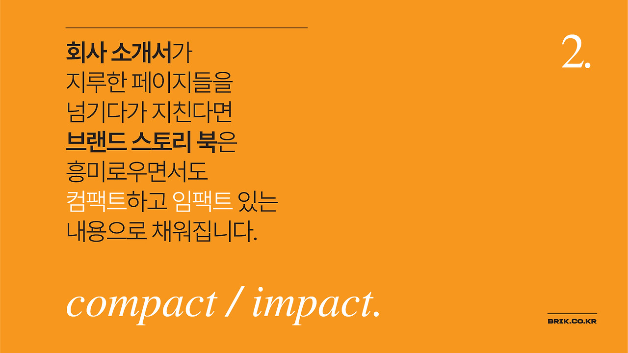 이 브랜드 홍보 책자는 브랜드와 관련된 내용을 브랜딩 관점에서 해석하고 가공하여 고객들에게 브랜드를 더욱 매력적으로 표현할 수 있는 장점이 있습니다. 사실 브랜드를 설명하자면 비전과 철학, 핵심가치와 역량, 차별성과 경쟁력, 제품 설명 등등 마음먹고 늘어놓자면 수백 페이지에 달하는 내용일 수 있습니다. 하지만 이렇게 긴 내용을 다 살펴볼 고객들은 없을 것입니다. 브랜드의 얘기를 끝까지 진지하게 들어주기에 고객들은 항상 바쁩니다. 그러므로 꼭 필요한 메시지와 흥미로운 이야기만으로 텍스트를 구성해야 합니다. 콤팩트한 브랜드 스토리북이 정보로 가득한 회사소개서와는 다른 점입니다.