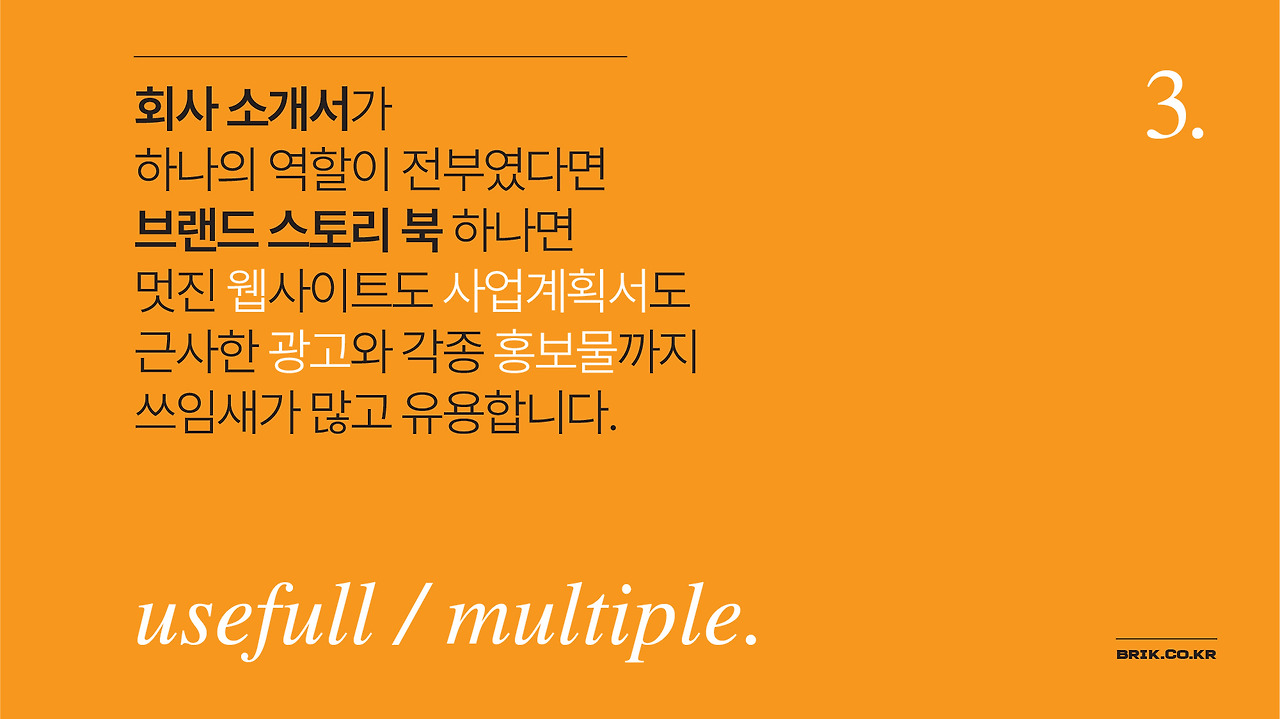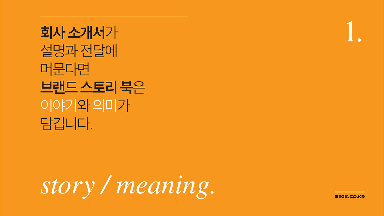 이러한 상황에서 저희 BRIK이라는 회사의 역할을 다시 한번 생각해 보게 됐습니다. 스타트업이나 중소기업 고객사 입장에서는 브랜드 전략을 세우는 전문 컨설팅사들까지 감당하기에는 너무나 큰 예산이 듭니다. 브랜드 소개서나 회사 소개서를 디자인 회사는 많지만 그걸 브랜딩 차원에서 이해하고 콘텐츠를 정리해줄 회사는 많지 않습니다. 그에 비해 브랜드 디자인은 인터넷을 조금만 뒤져봐도 실력 있는 회사들과 프리랜서들이 넘쳐납니다. 물론 개발 비용은 천차만별이긴 하지만요. 회사의 예산에 맞는 곳을 찾으면 될 일입니다.