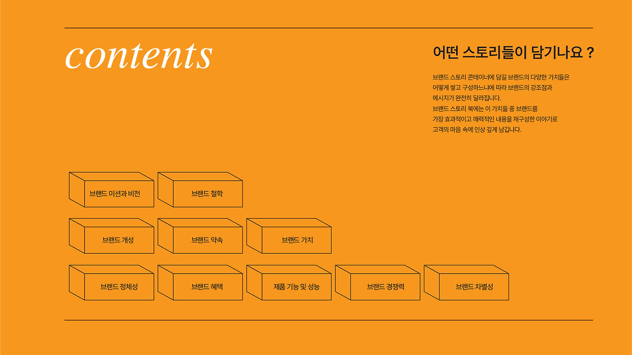 사실 브랜드 스토리라는 컨테이너에 담길 내용들은 너무나 많습니다. 이 내용들을 어떻게 쌓고 구성하느냐에 따라 브랜드 메시지가 달라집니다. 브랜드 스토리 북은 이 많은 가치들 중 브랜드에 꼭 필요하고 고객들에게 강조할 내용들만 골라 재구성할 것입니다. 많은 내용이지만 스토리라는 실로 엮어내면 가볍고 단순하게 다가갈 수 있습니다.