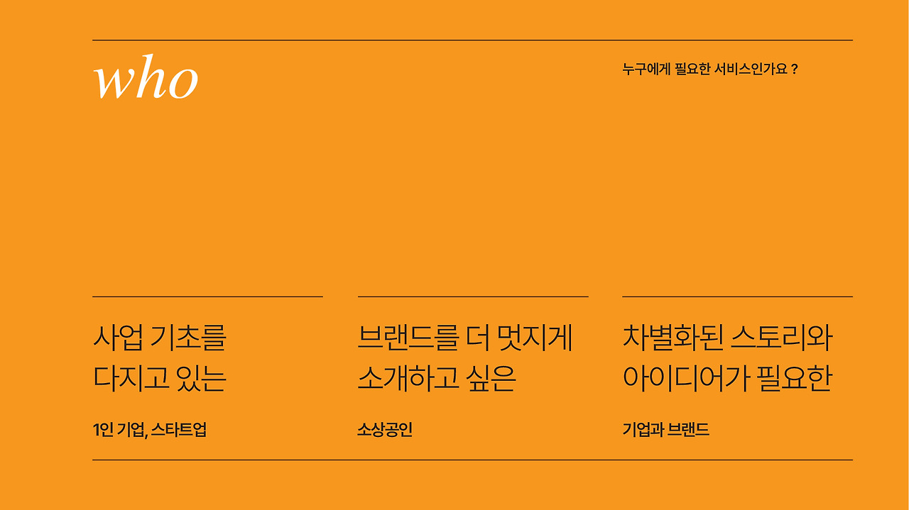 첫 번째는 사업을 막 시작하려는 스타트업 브랜드에게 필요하겠습니다. 좋은 사업 아이템을 가지고 있고, 성공시킬 충분한 기술력을 보유하고 있지만 아직은 브랜드에 대한 개념도 방향성도 잡혀있지 않는 브랜드들에게 브랜드의 초석을 다지는 역할을 해 줄 수 있을 것입니다.