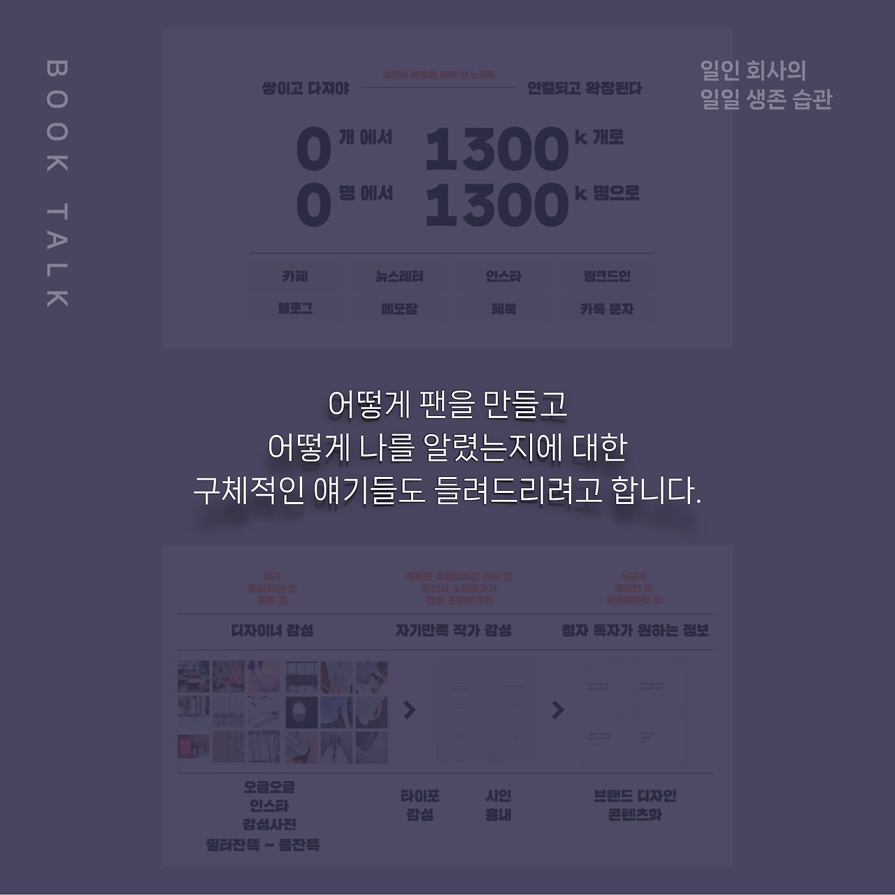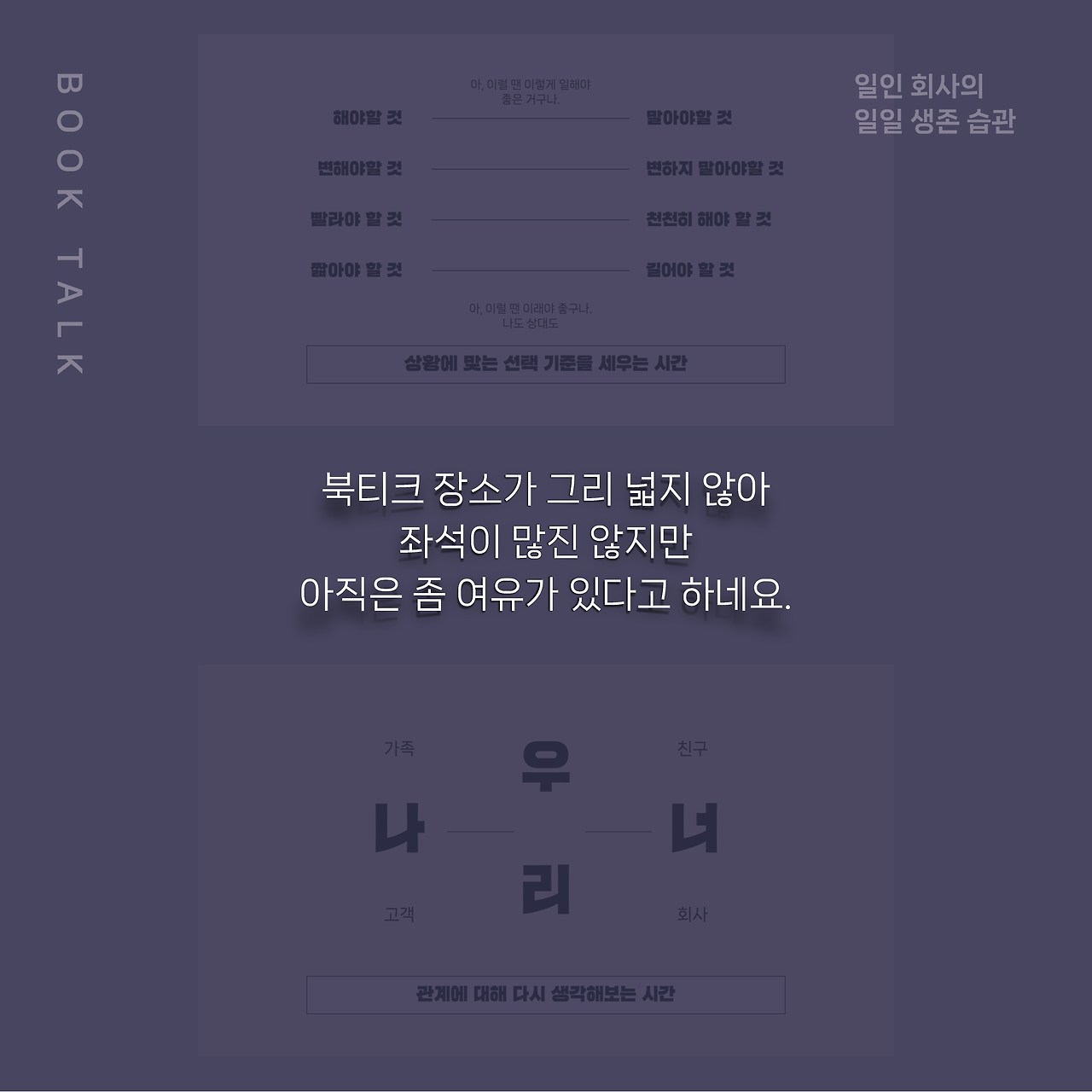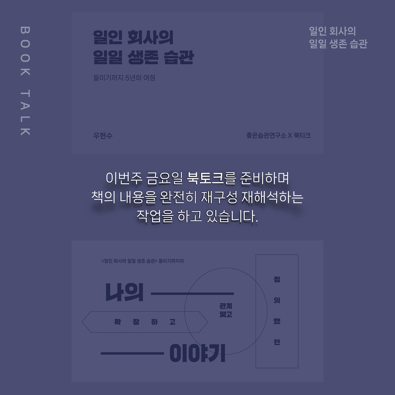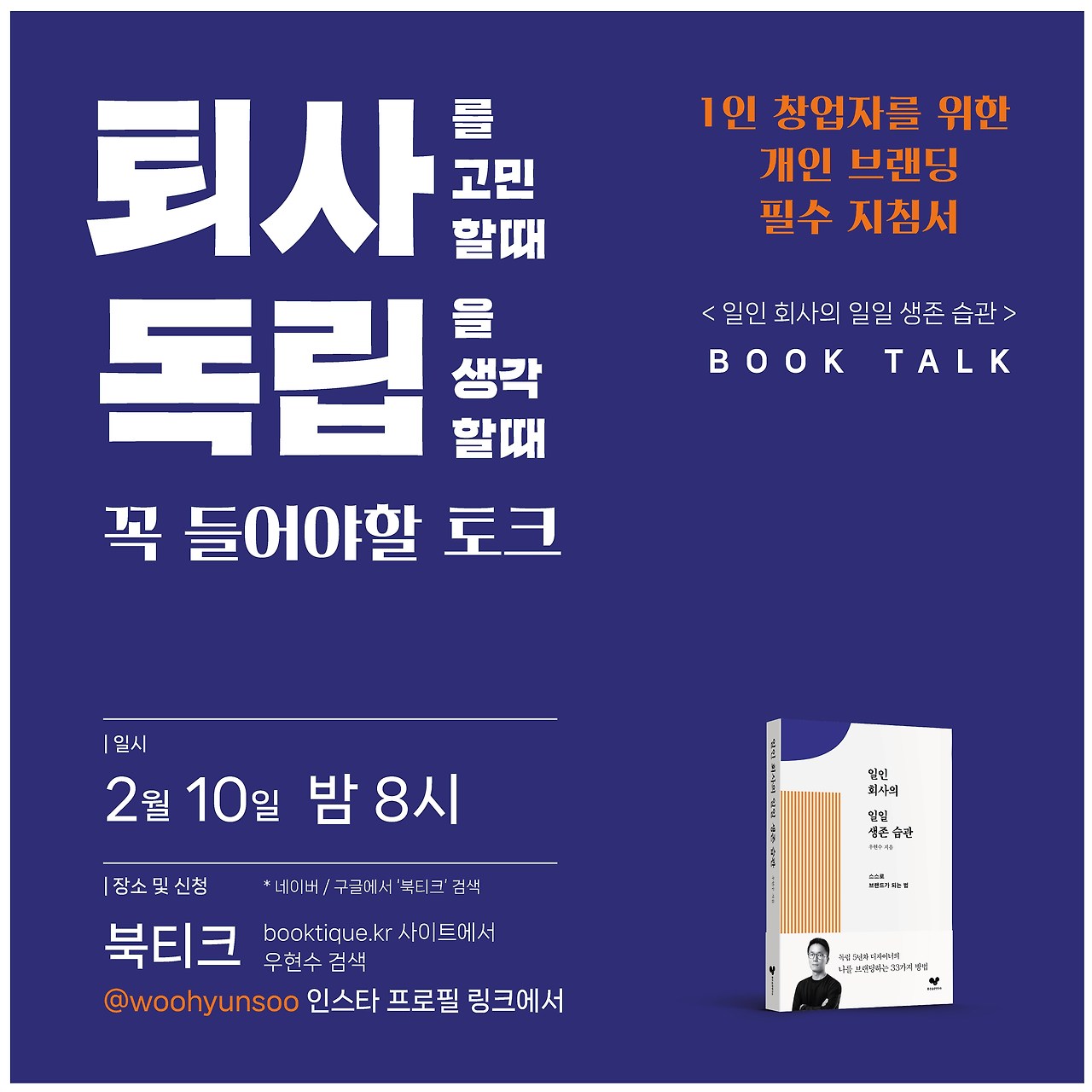 이번주 금요일(2월 10일)에 북티크에서 열리는 북토크를 준비하고 있습니다. 오시는 분들께 최대한 도움이 되시는 얘기를 해드리고 싶은 마음에 프로젝트 PT를 준비하듯 자료 정리를 하고 구성하기를 반복하고 있습니다.