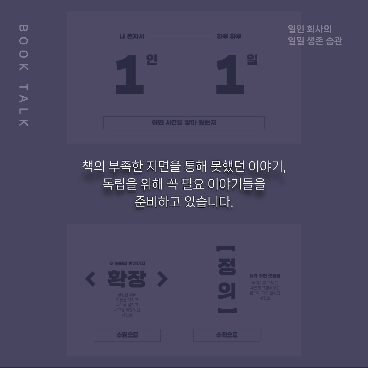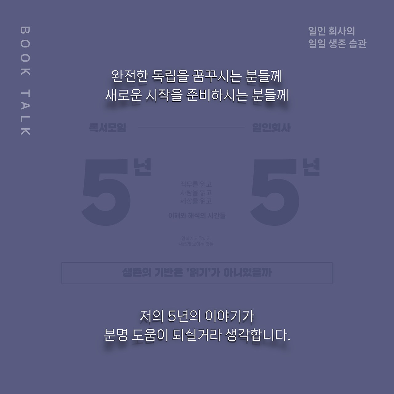 책을 꼭 구입하거나 읽고 오실 필요도 없습니다. 가벼운 마음으로 오셔서 저의 독립 5년의 이야기를 편하게 들어주셨으면 좋겠습니다. 완전한 독립을 꿈꾸시는 분들, 이제 새로운 시작을 하려는 분들께 분명 도움이 되실거라 생각합니다.