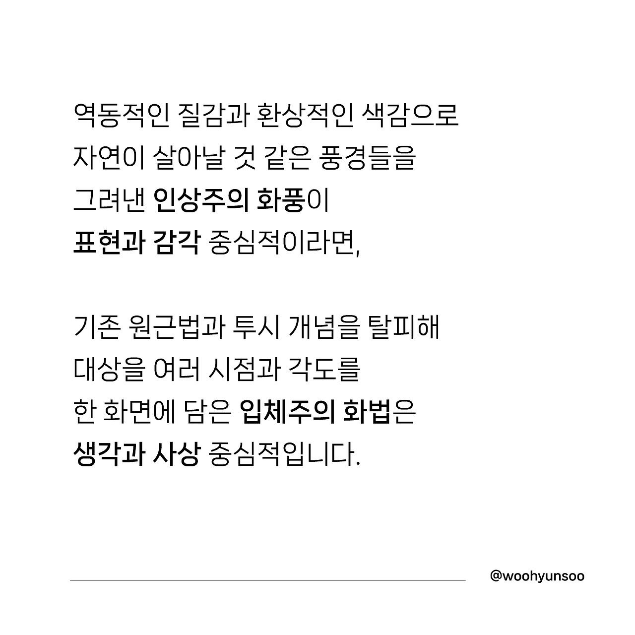역동적인 질감과 환상적인 색감으로 자연이 살아날 것 같은 풍경들을 그려낸 인상주의 화풍이 표현과 감각 중심적이라면, 기존 원근법과 투시 개념을 탈피해 대상을 여러 시점과 각도를 한 화면에 담은 입체주의 화법은