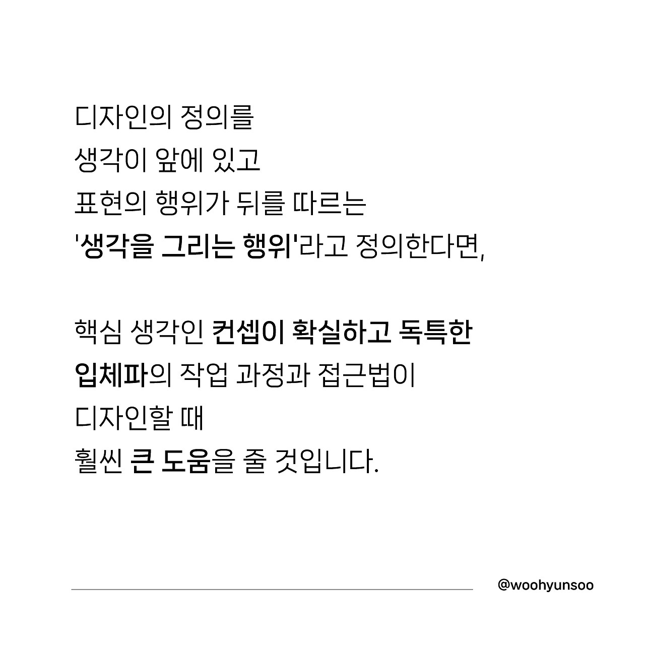생각과 사상 중심적입니다. 디자인의 정의를 생각이 앞에 있고 표현의 행위가 뒤를 따르는 '생각을 그리는 행위'라고 정의한다면, 핵심 생각인 컨셉이 확실하고 독특한 입체파의 작업 과정과 접근법이 디자인할 때 훨씬 큰 도움을 줄 것입니다.