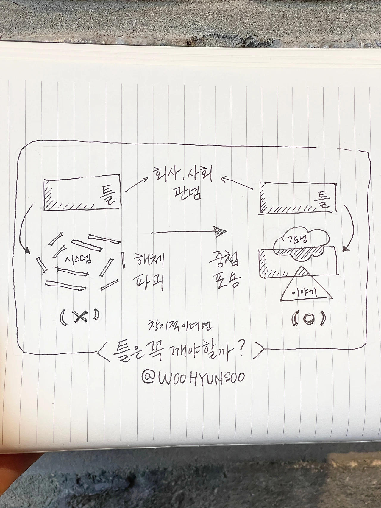 틀에서 도망갈 바에야 처음부터 새로운 틀을 만드는 도전을 해야겠다는 생각도 듭니다. 하지만 그런 엄청난 혁신을 내가 이룰만큼의 능력이 있느냐는 항상 의문입니다. 그렇게나 견고한 틀이 나 정도의 미약한 힘으로 깨진다면 일년에도 수백번씩 그런 틀이 우리 주위에서 깨져 버렸겠죠. 쉽지 않은 일입니다.