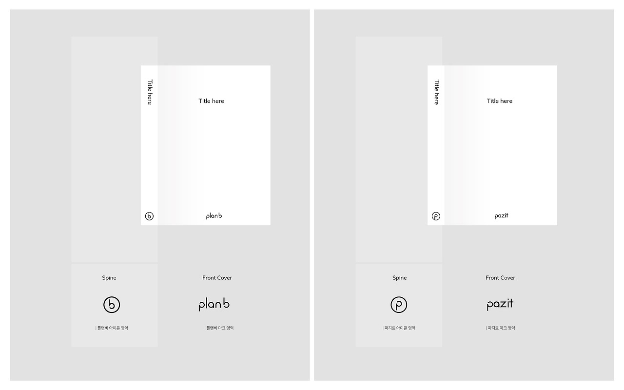 영어로 된 이름을 굳이 한글 로고타입으로 표현하는 출판 업계의 관행과는 다르게 plan b - pazit 브랜드를 서적에 표기할 때 영문 그대로 적용했습니다. 책등에는 브랜드 아이콘을 넣어 좁은 적용 면적의 한계 넘어 시인성과 주목도를 높였습니다. 책표지에는 브랜드 마크를 적용해 브랜드명이 읽힐 수 있게 했습니다. 이 기준은 앞으로 plan b - pazit의 모든 출판물의 브랜드 표기 기준이 될 것입니다.