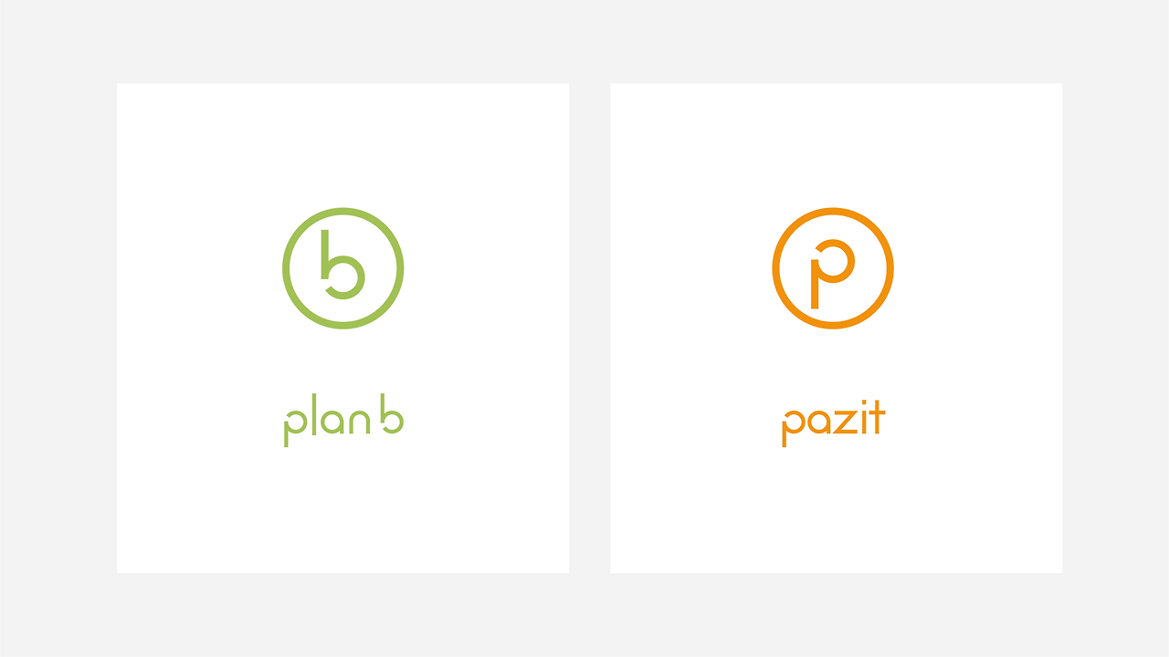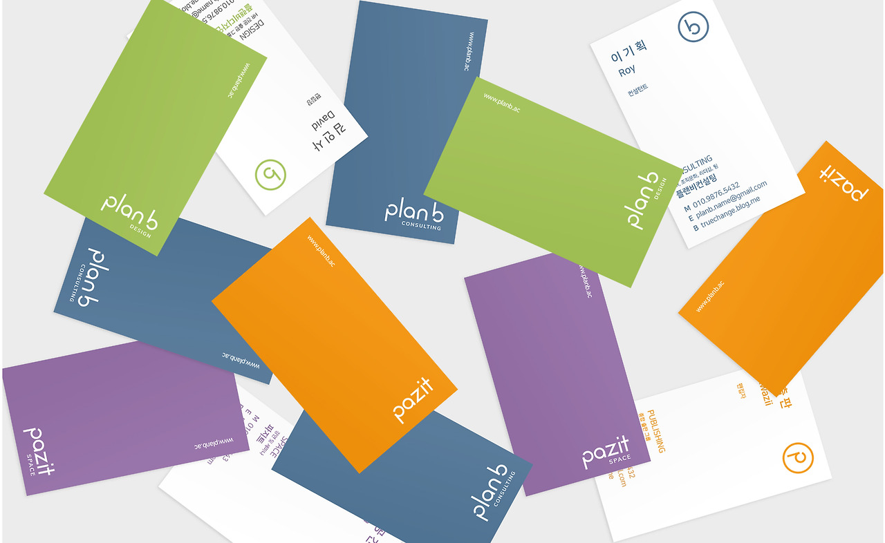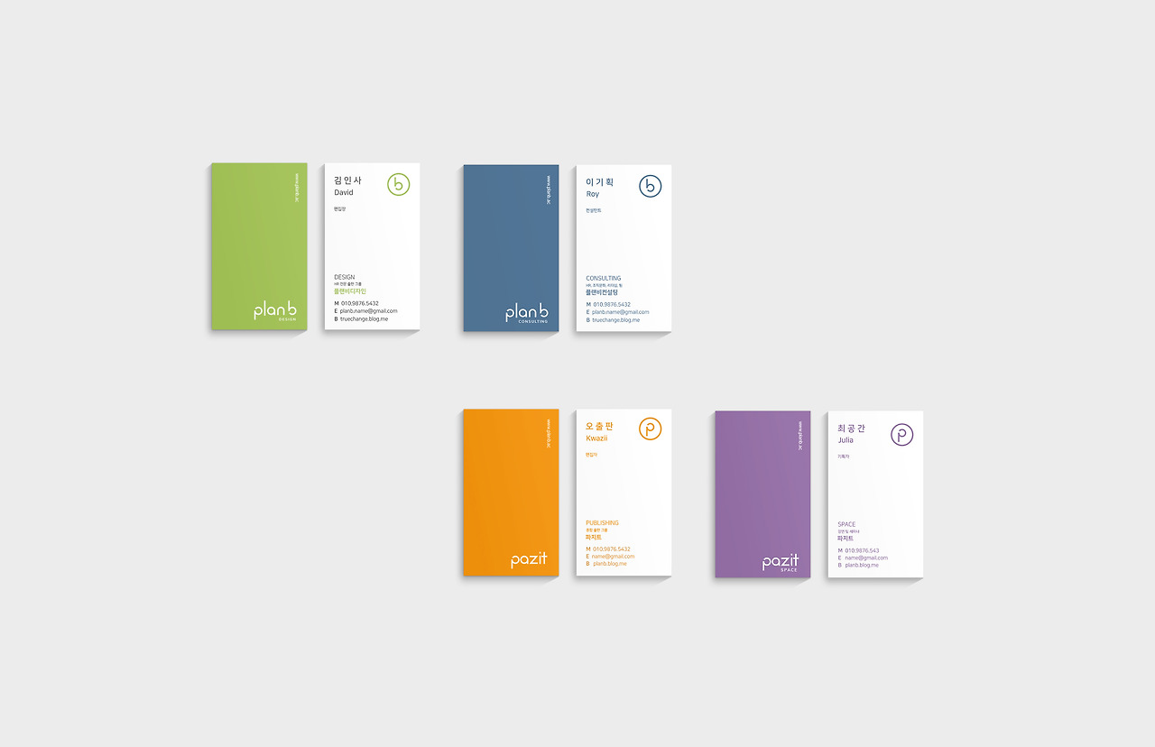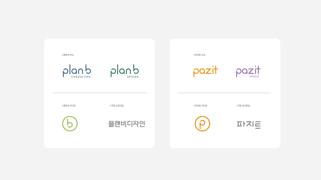 plan.b의 두 사업 플랜비디자인과 플랜비컨설팅은 plan.b마크를 공유하되 색상만 달리 표현했습니다. pazit는 출판사와 모임 강연 공간 브랜드를 색상으로 구분했습니다. 향후 확장되는 사업의 영역을 고려한 방안입니다.