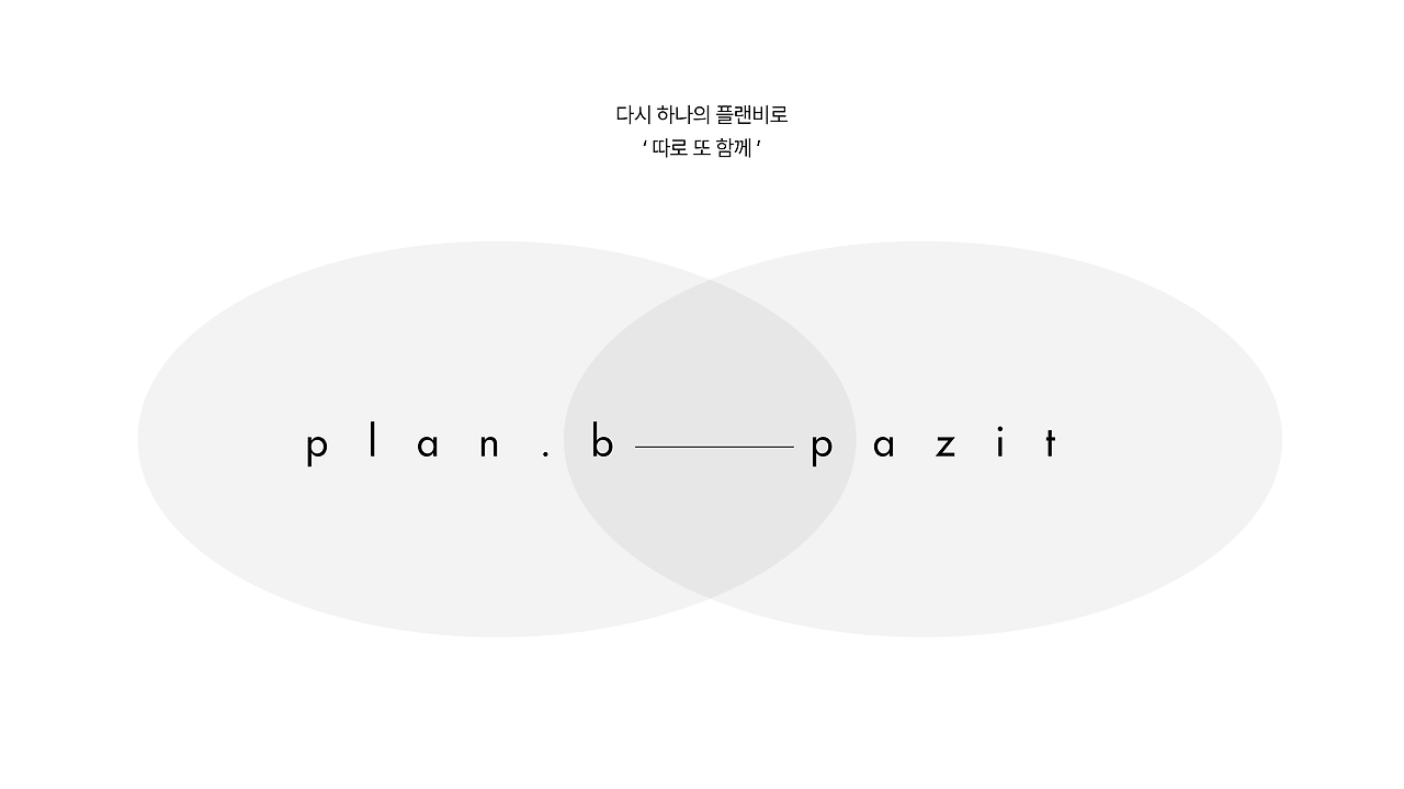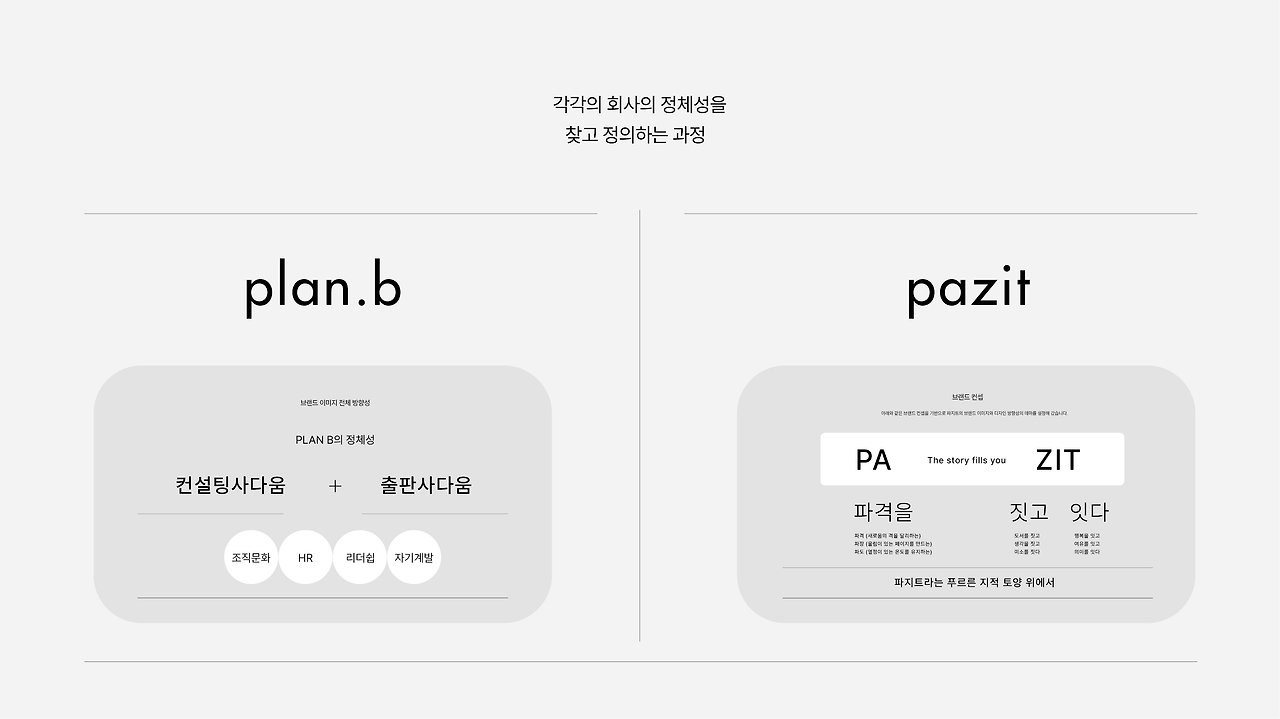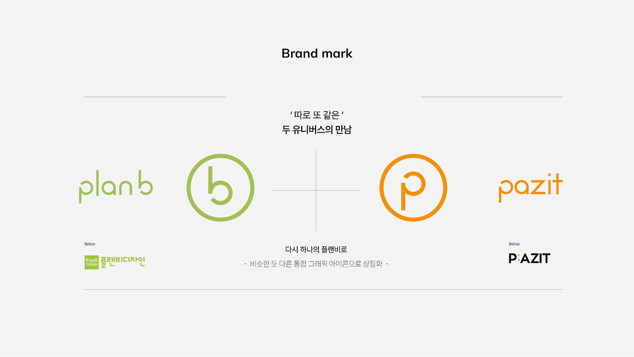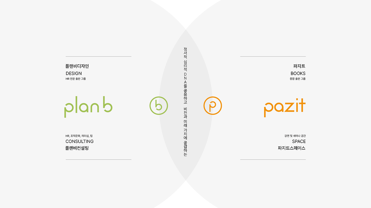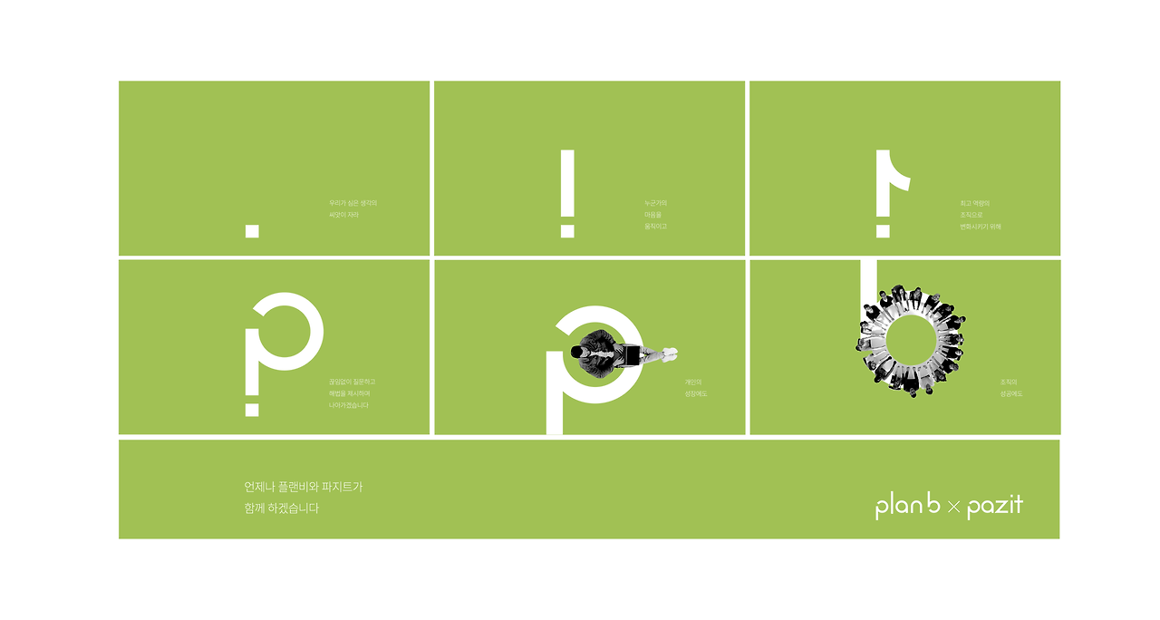 plan.b와 pazit라는 회사명은 달라도 시각적으로 보이는 이미지는 유사한 느낌을 받을 수 있게 디자인했습니다. 이러한 조형적인 특성은 플랜비-파지트가 전혀 다른 회사가 아니라 하나라는 느낌을 전달합니다.