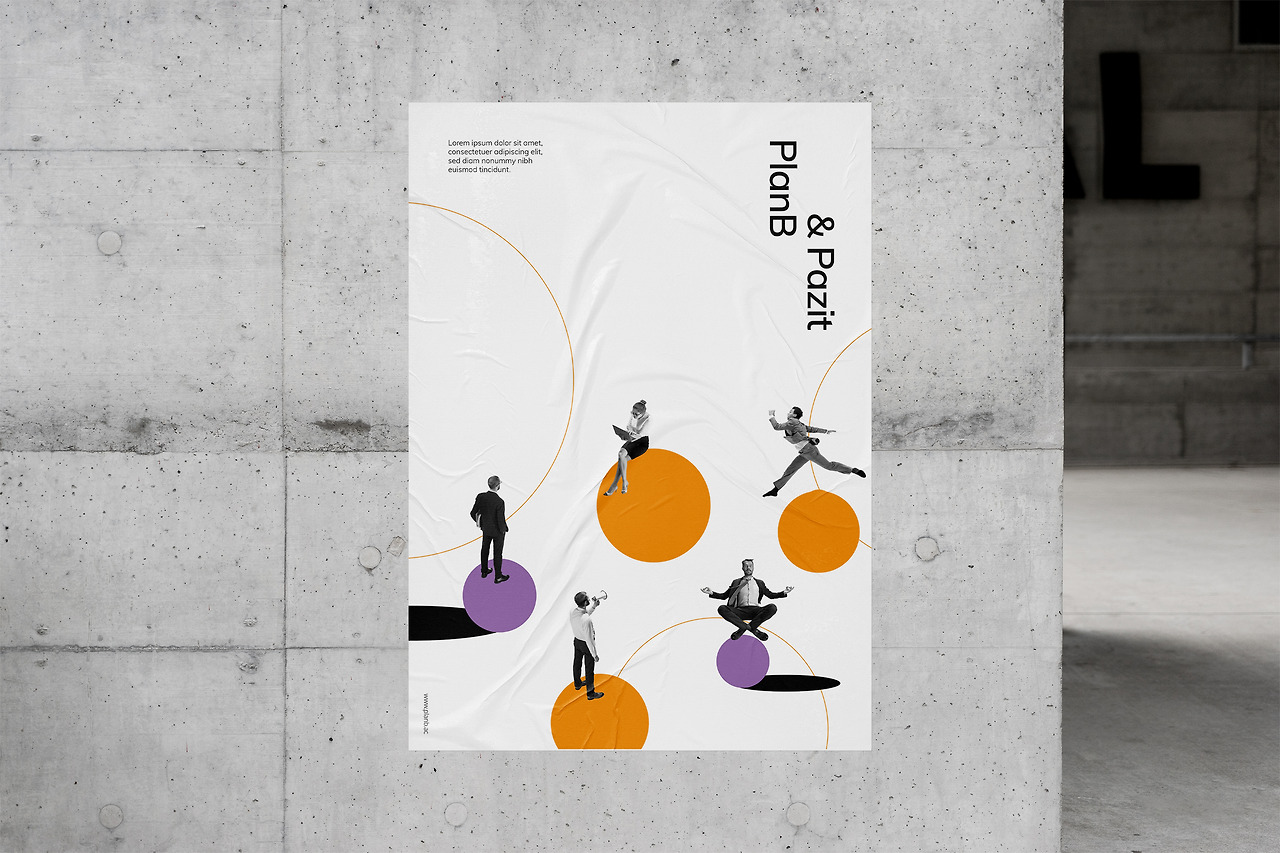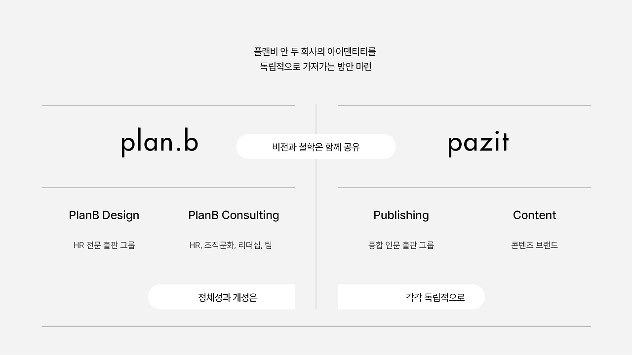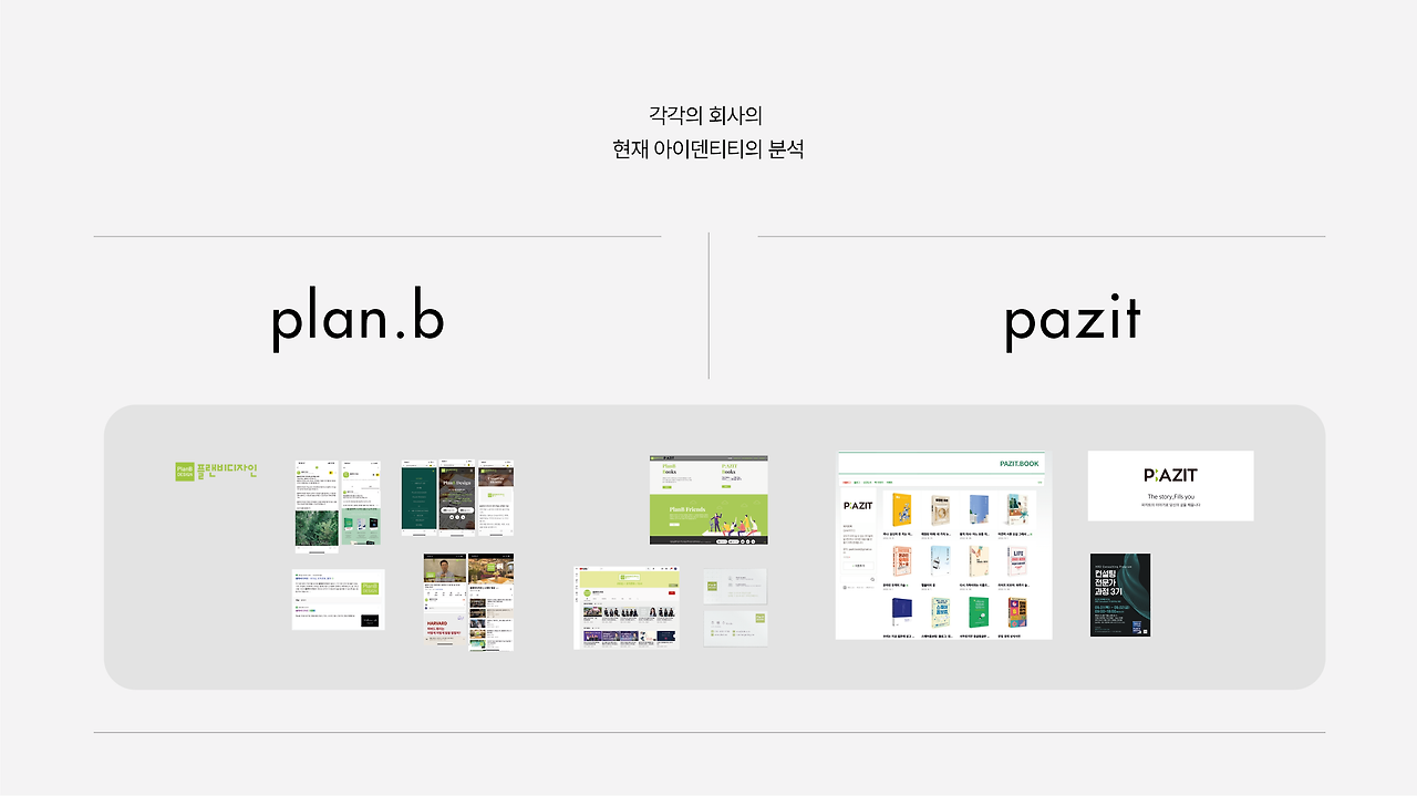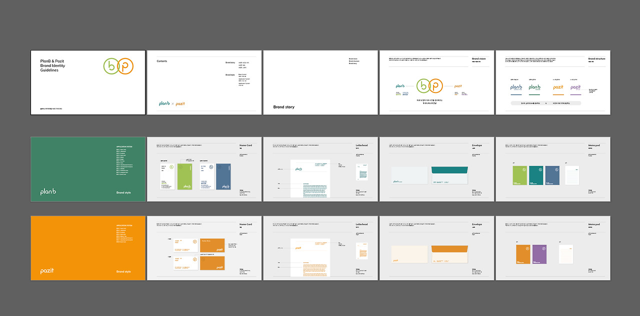 plan.b와 pazit라는 회사명은 달라도 시각적으로 보이는 이미지는 유사한 느낌을 받을 수 있게 디자인했습니다. 이러한 조형적인 특성은 플랜비-파지트가 전혀 다른 회사가 아니라 하나라는 느낌을 전달합니다.
