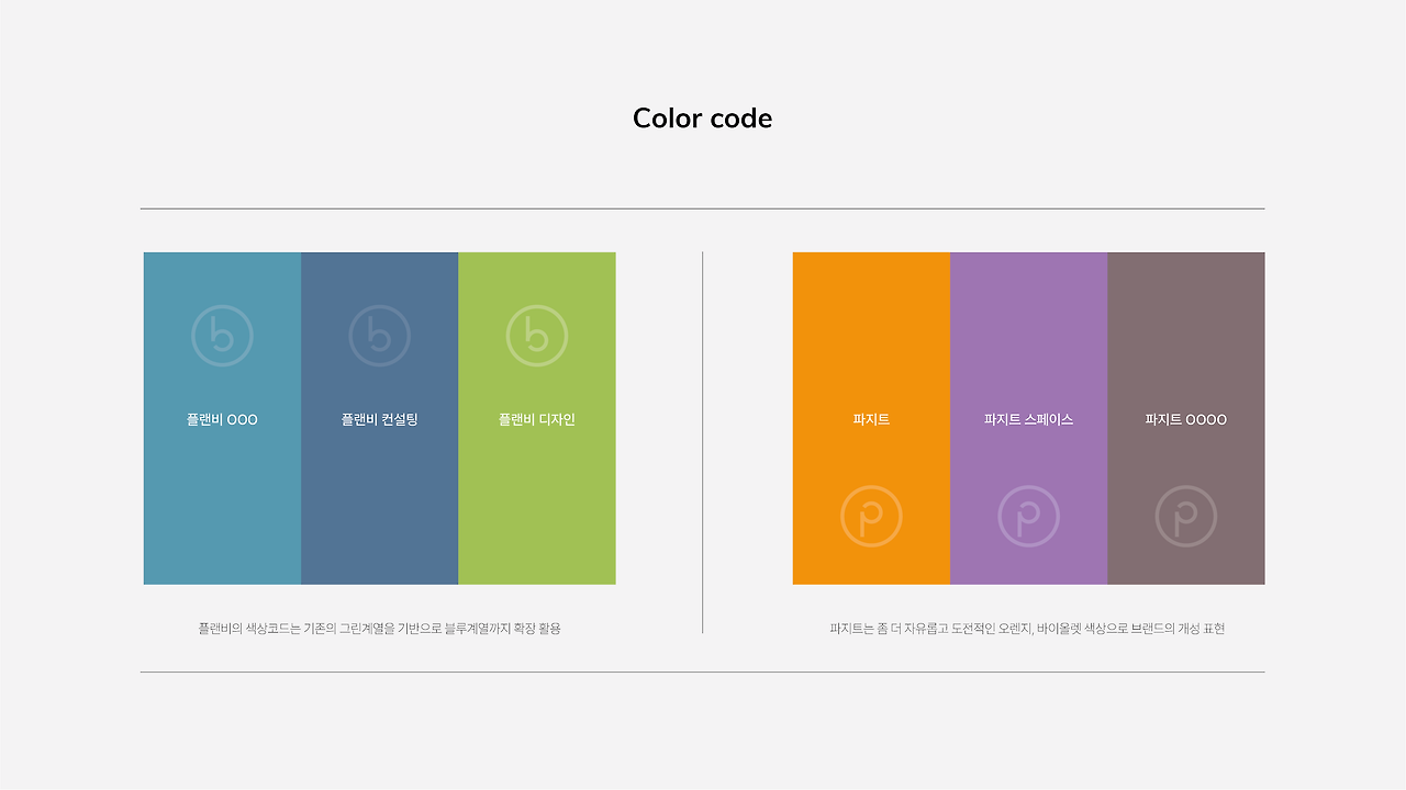 플랜비의 색상코드는 기존 옐로 그린을 기반으로 블루계열까지 확장한 색상을 사용했습니다. 파지트는 좀 더 자유롭고 도전적인 오렌지, 바이올렛 색상을 위주로 브랜드의 개성을 표현했습니다.