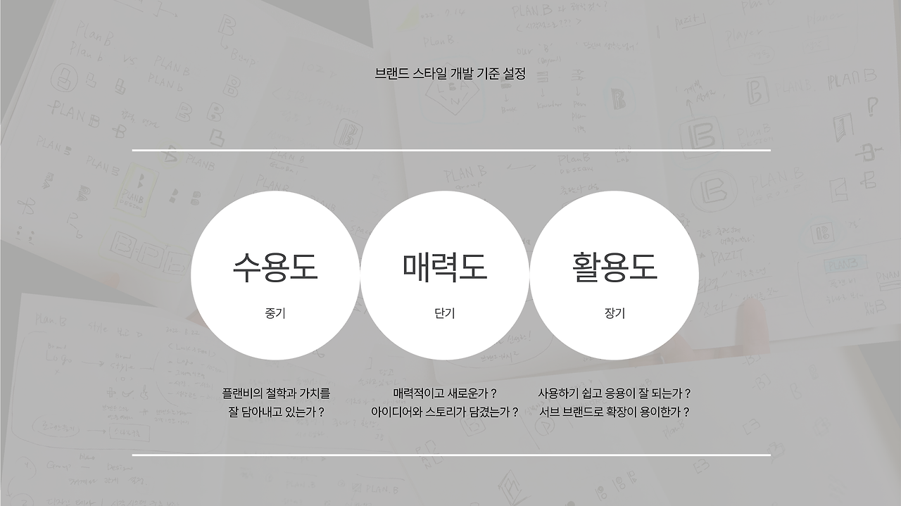 PlanB 브랜드 스타일 구축에 있어서 세 가지를 강조했습니다. 수용도, 매력도, 활용도입니다. 수용도는 고객들이 플랜비의 철학과 가치를 잘 느낄 수 있게 담긴 의미와 메시지들을 쉽게 잘 담아내야 한다는 의미입니다. 매력도는 고객의 관심을 끌고 지속적인 관계를 이어가기 위한 스토리와 아이디어를 점검해 보는 지표입니다. 마지막으로 활용도는 적용된 브랜드스타일이 앞으로 활용하기 쉬운지 응용이 가능한 것인지, 향후 기타 브랜드로도 확장이 용이한지를 점검하는 차원의 기준입니다.