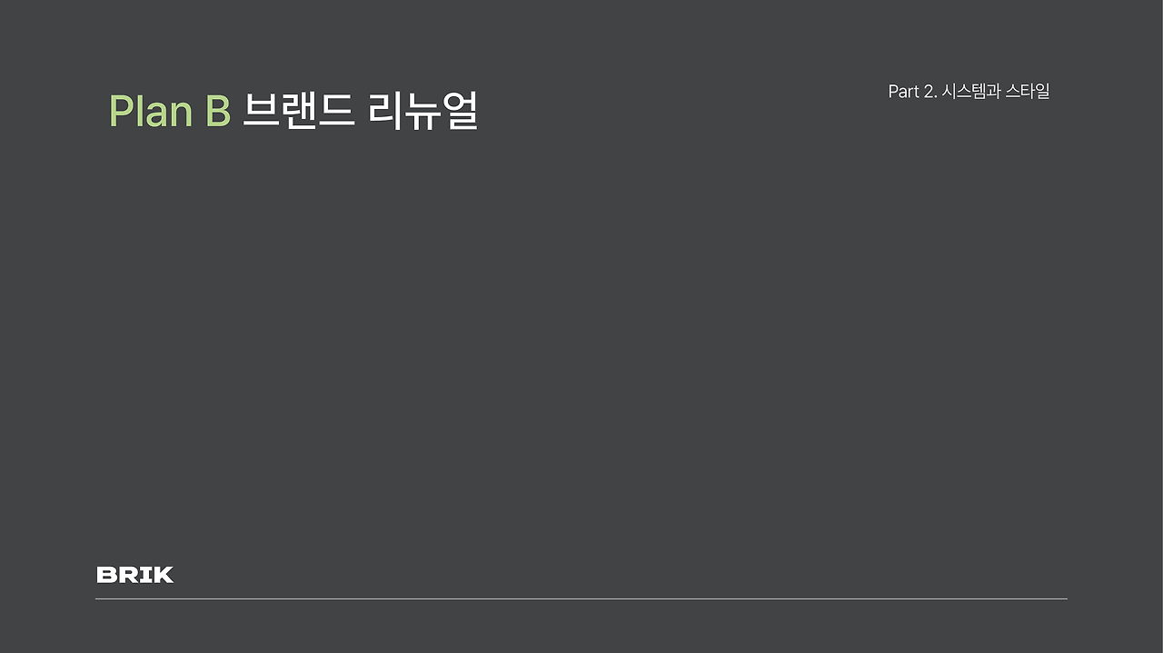 [Part 1. 전략과 스토리]에서는 내외부 설문을 통해 PlanB 브랜드의 콘셉트를 도출하고 플랜비다움을 정의하는 과정을 살펴봤습니다. [Part 2. 스타일과 시스템] PlanB에서는 Part 1.을 기반으로 앞으로 어떤 방향으로 PlanB 스타일을 구축해 갔는지 살펴보겠습니다.