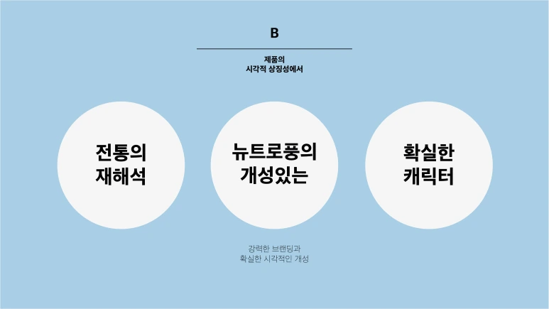 제품의 시각적 상징성에 있어서는 기존 전통을 재해석한 이미지, 뉴트로풍으로 개성 있는 이미지, 확실한 캐릭터로 인상적인 이미지를 부여하는 방법을 생각할 수 있겠습니다.