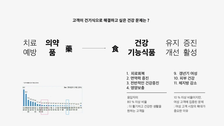 건기식 협회 조사에 의하면 응답자의 80% 이상이 피로회복, 면역력 증진, 전반적 건강증진, 영양 보충을 위해 건기식을 구입한다고 합니다. 갱년기 여성, 피부 건강, 체지방 감소 등은 비록 10% 정도 밖에는 안되지만, 정확히 여성 고객들을 타깃으로 한다는 점에서 주의 깊게 살펴볼 시장입니다.