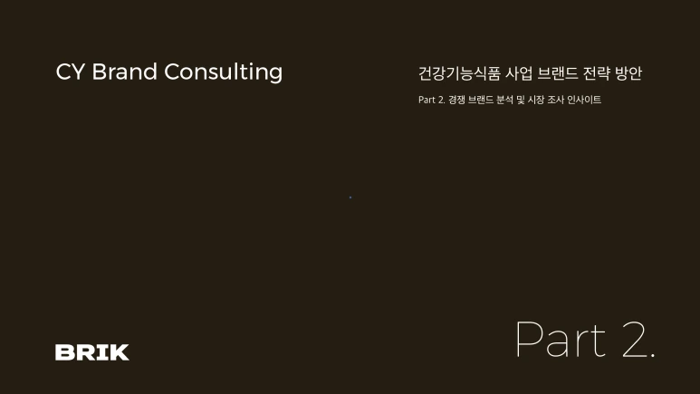 Part1. 브랜드 진단 및 컨셉 설정에 이어서 Part 2,3에서는 건기식 경쟁 브랜드 분석과 시장 조사를 통해 전체 시장을 보는 인사이트를 가져오는 시간을 가질 것입니다. 그러한 인사이트를 기반으로 CY 건기식 브랜드가 앞으로 펼쳐가야 할 브랜드 전략과 방향성을 검토할 것입니다.