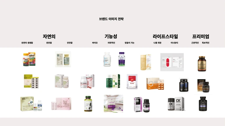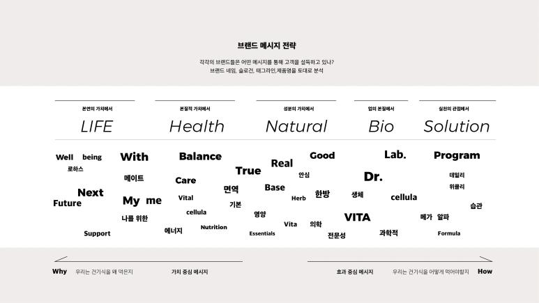 경쟁 브랜드 분석 결과 브랜드가 고객에게 전달하고자 하는 메시지는 5가지 정도로 나눌 수 있었습니다. 건기식 본연의 가치를 강조한 'Life'중심의 메시지, 본질적 가치인 건강함 'Health'을 말하는 브랜드, 자연 성분의 특징과 장점을 내세우는 'Natural'의 메시지를 보내는 브랜드, 업의 본질이라고 할 수 있는 'Bio'산업 특유의 과학적인 메시지 그리고 마지막으로 실천적 관점에서 복용의 습관을 위한 'Solution'이나 프로그램적인 성격이 강한 브랜드로 나눌 수 있었습니다. 이러한 키워드들은 각 브랜드의 네임, 슬로건, 태그라인, 제품명 등에 들어가 고객들을 설득하는 장치로 사용되고 있었습니다.