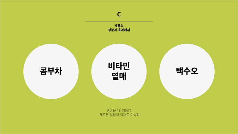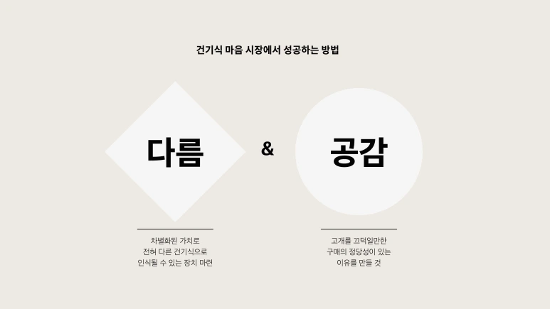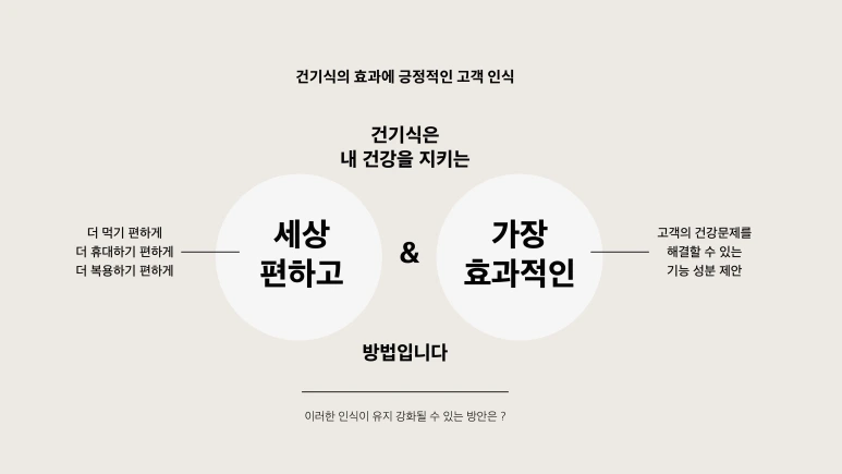 그러기 위해서는 다름과 공감의 요소가 다 필요합니다. 차별화된 가치로 전혀 다른 건기식이라는 인식을 줄 수 있는 장치와 동시에 고개를 끄덕일만한 구매의 정당성을 갖출 수 있는 공감의 요소도 있어야 하겠습니다.