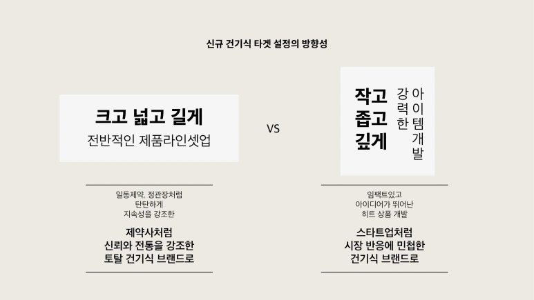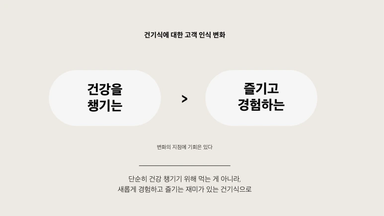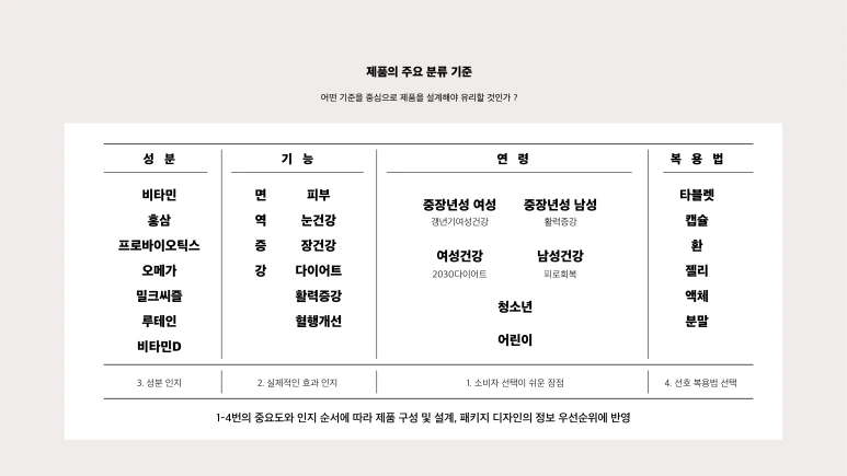 그러한 다름과 공감의 요소들이 건기식에 적용될 수 있는 프레임 워크를 만들고, 그 안에서의 차별화될 수 있는 요소들을 발견해가는 과정을 거쳤습니다.