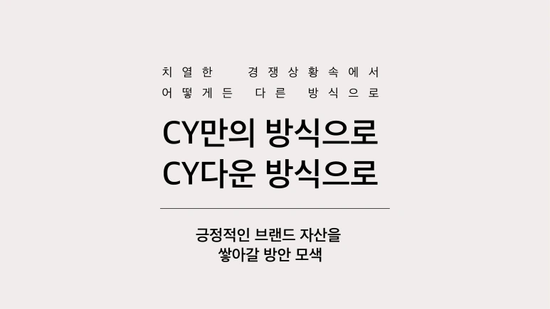 이처럼 다양한 상황과 업역에서 개발되고 있는 '건기식'브랜드들 사이에서 CY 건기식이 경쟁력을 가져가기 위해서는 어떻게든 CY만의 방식으로 CY 다운 방식으로 브랜드 경쟁력을 키우고, 자산을 쌓아가야 하겠습니다.