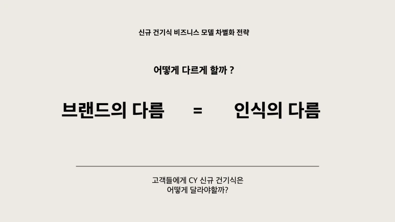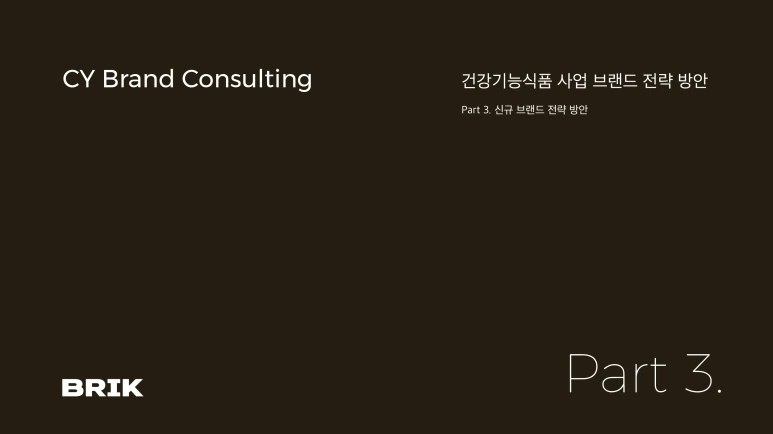 그럼 다음 편에서는 마지막으로 Part 4,5 브랜드 구조 개선 방안과 브랜드 디자인 방향성에 대해 설명드리고 CY 건기식 브랜드 컨설팅 과정에 대한 소개를 마치겠습니다.